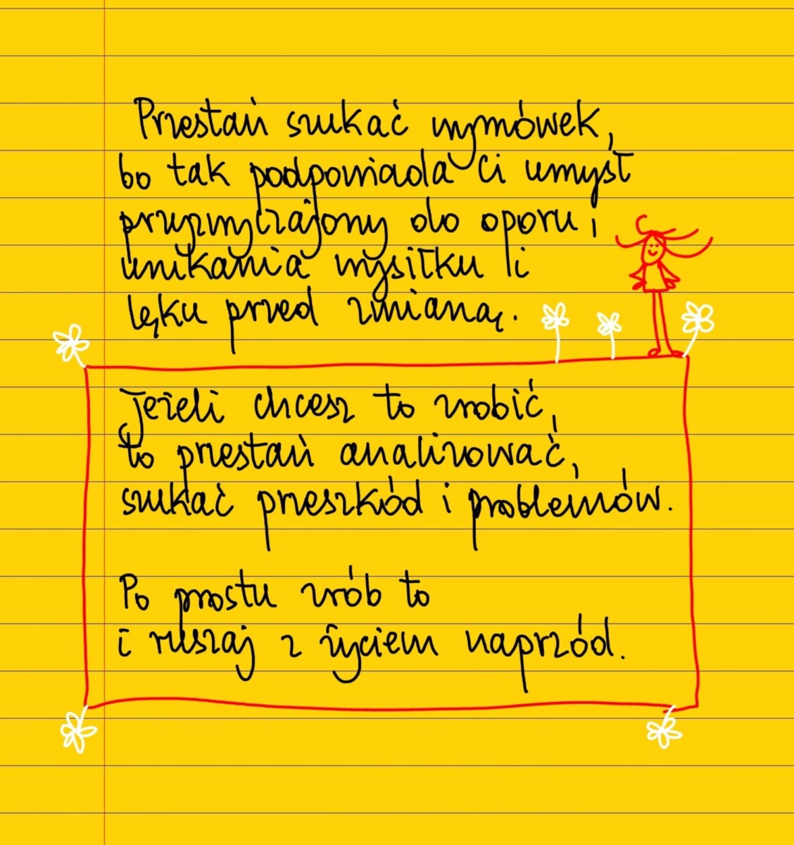 Żółte kartki Przestań szukać wymówek środa, 03.12.2025 Przestań szukać wymówek, bo tak podpowiada ci umysł przywyczajony do unikania wysiłku i lęku przed zmianą. Jeżeli chcesz to zrobić, to przestań analizować i szukać problemów. Po prostu zrób to i ruszaj naprzód ze swoim życiem. #żółtakartka Udostępnij na Facebooku