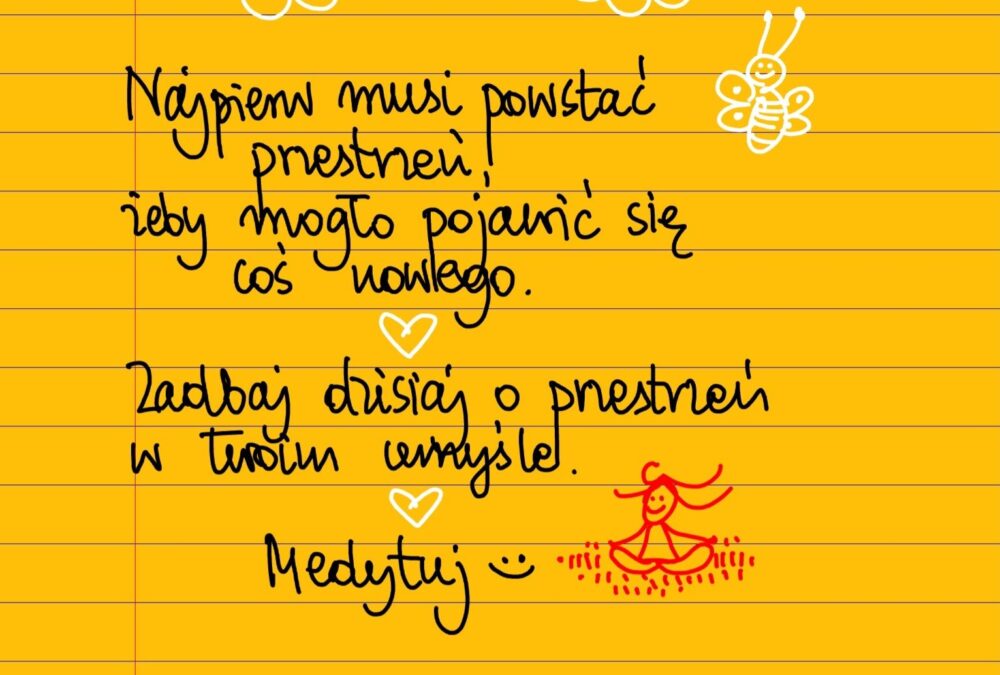 Żółte kartki Przestrzeń środa, 20.09.2023 Najpierw musi powstać przestrzeń, żeby mogło pojawić się coś nowego. Zadbaj dzisiaj o przestrzeń w twoim umyśle. Medytuj ❤ #żółtakartka Udostępnij na Facebooku