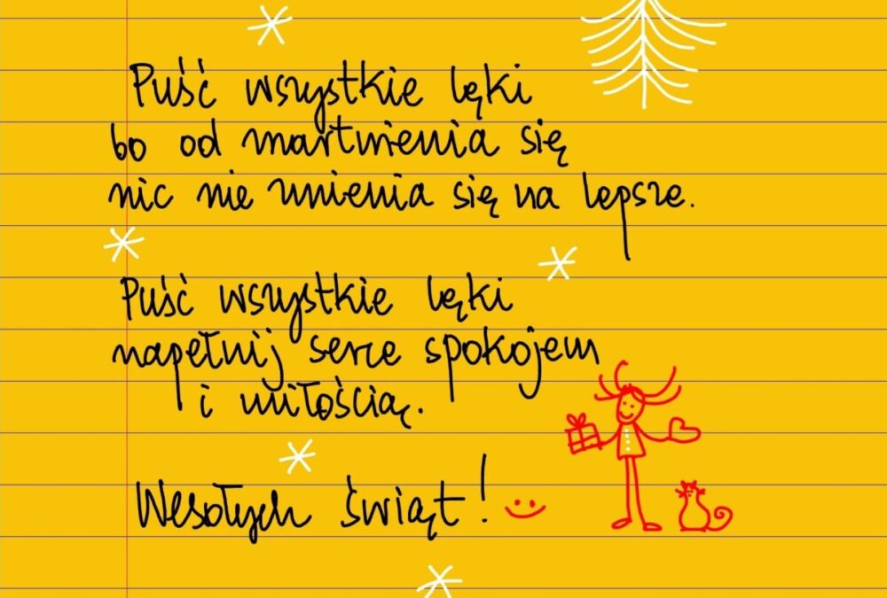 Żółte kartki Puść wszystkie lęki, środa, 22.12.2021 Puść wszystkie lęki, bo od martwienia się nic nie zmienia się na lepsze. Puść wszystkie lęki, napełnij serce spokojem i miłością. Wesołych świąt! #żółtakartka Udostępnij na Facebooku