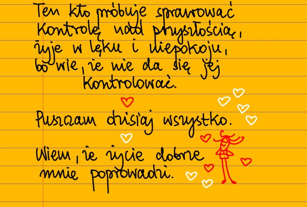 Żółte kartki Puszczam dzisiaj wszystko czwartek, 19.10.2023 Ten kto próbuje sprawować kontrolę nad przyszłością, żyje w ciągłym lęku i niepokoju, bo wie w głębi duszy, że nie da się jej kontrolować. Puszczam dzisiaj wszystko. Wiem, że życie najlepiej mnie poprowadzi. Udostępnij na Facebooku