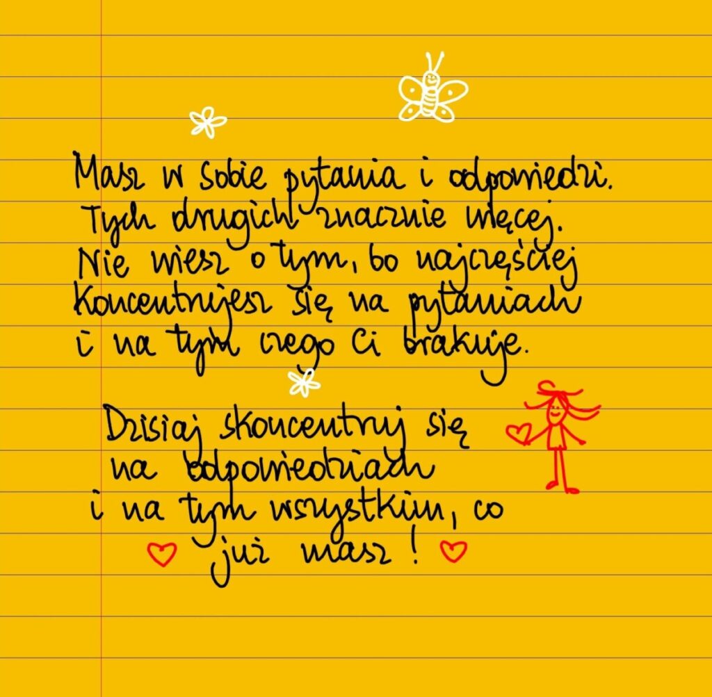 Żółte kartki Pytania i odpowiedzi czwartek, 24.03.2022 Masz w sobie pytania i odpowiedzi. Tych drugich znacznie więcej. Nie wiesz o tym, bo najczęściej koncentrujesz się na pytaniach i na tym, czego Ci brakuje. Dzisiaj skoncentruj się na odpowiedziach i na tym, co już masz!! #żółtakartka Udostępnij na Facebooku