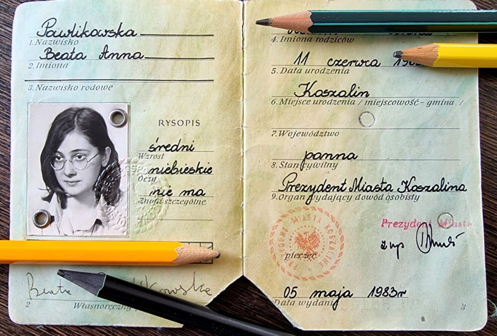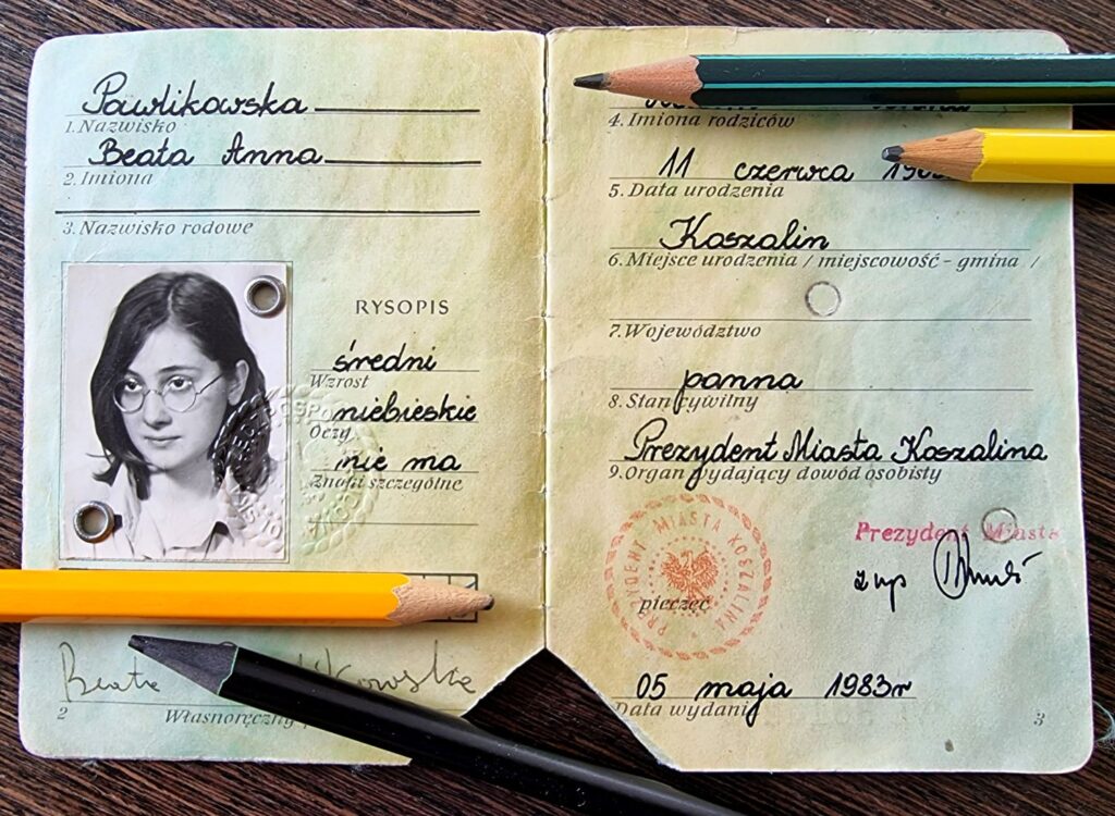 To było rok przed maturą 🙂 Pamiętam, że padał lekki majowy deszcz kiedy weszłam do zakładu fotograficznego, żeby zrobić zdjęcie do mojego pierwszego dowodu osobistego 🙂 Miałam na sobie jasnofiołkową koszulę z długimi rękawami. Z pudełka ze zdjęciami wypadła ta mała zielona książeczka, otworzyłam ją i nagle dostrzegłam, że to było dokładnie 5 maja 🙂 Pamiętam tę dziewczynę ze zdjęcia. Była zbuntowana, uciekała ze szkoły, chciała tylko pisać opowiadania, rysować i słuchac muzyki, głównie Beatlesów 🙂 Dzisiaj czuję, że wciąż nią jestem, tylko dużo bardziej szczęśliwa ❤