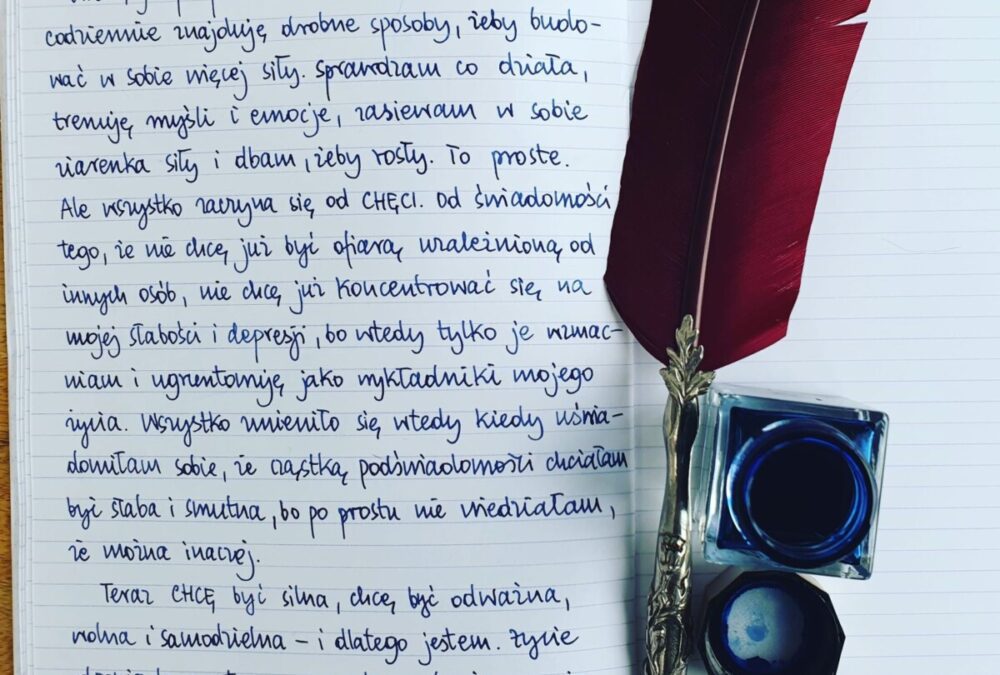 Wiesz, ja po prostu CHCĘ. Chcę być silna i codziennie znajduję drobne sposoby, żeby budować w sobie więcej siły. Sprawdzam co działa, trenuję myśli i emocje, zasiewam w sobie ziarenka siły i dbam, żeby rosły. To proste. Ale wszystko zaczyna się od CHĘCI. Od świadomości tego, że nie chcę już być ofiarą uzależnioną od innych osób, nie chcę już koncentrować się na mojej słabości i depresji, bo wtedy tylko je wzmacniam i ugruntowuję jako wykładniki mojego życia. Wszystko zmieniło się wtedy kiedy uświadomiłam sobie, że cząstką podświadomości chciałam być słaba i smutna, bo po prostu nie wiedziałam, że można inaczej.