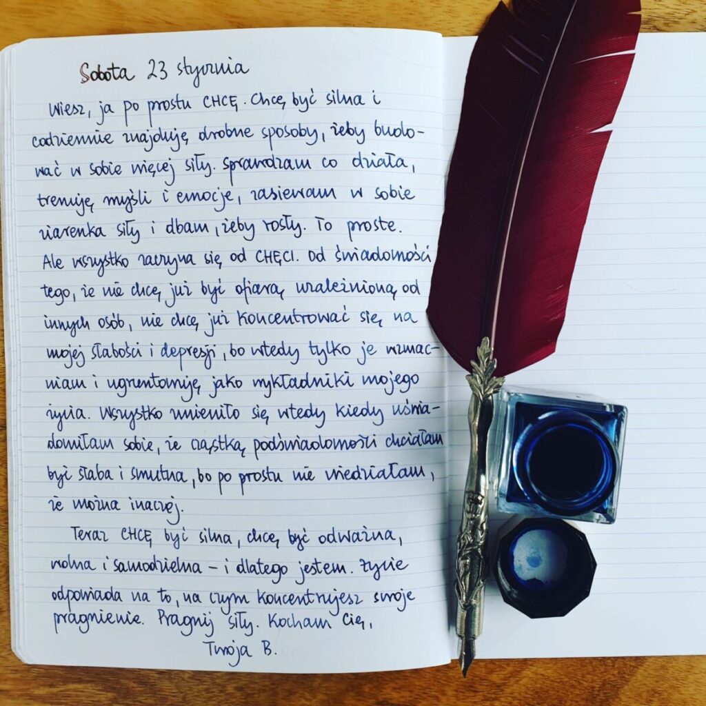 Teraz CHCĘ być silna, chcę być odważna, wolna i samodzielna – i dlatego jestem. Życie odpowiada na to, na czym koncentrujesz swoje pragnienie. Pragnij siły. Kocham Cię,