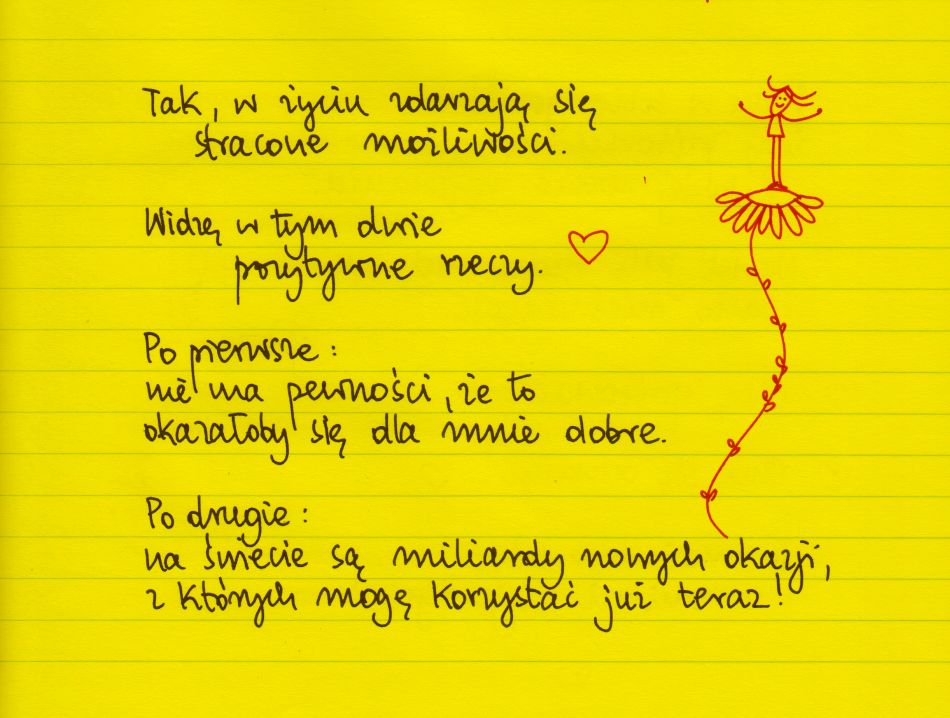 Żółte kartki Stracone możliwości poniedziałek, 29.11.2021 Tak, w życiu zdarzają się „stracone możliwości”. Widzę w tym dwie pozytywne rzeczy. Po pierwsze: nie ma pewności, że to okazałoby się dla mnie dobre. Po drugie: na świecie są miliardy nowych okazji, z których mogę korzystać już teraz! #żółtakartka Udostępnij na Facebooku