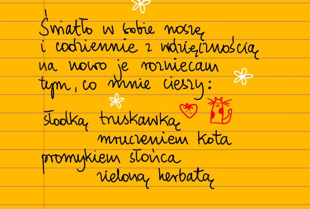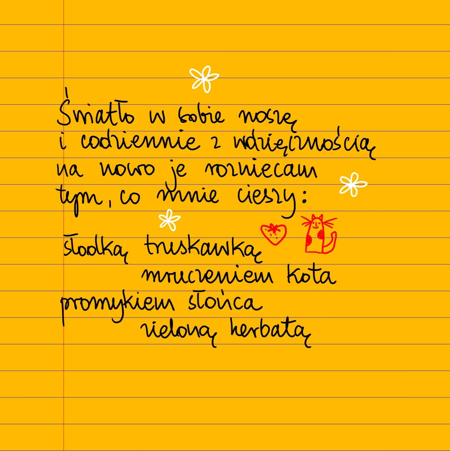 Światło w sobie noszę i codziennie z wdzięcznością na nowo je rozniecam przez wszystko, co mnie cieszy: słodką truskawką, obłokiem w kształcie kolibra, mruczeniem kota, pomykiem słońca, zieloną herbatą ❤ #żółtakartka #beatapawlikowska