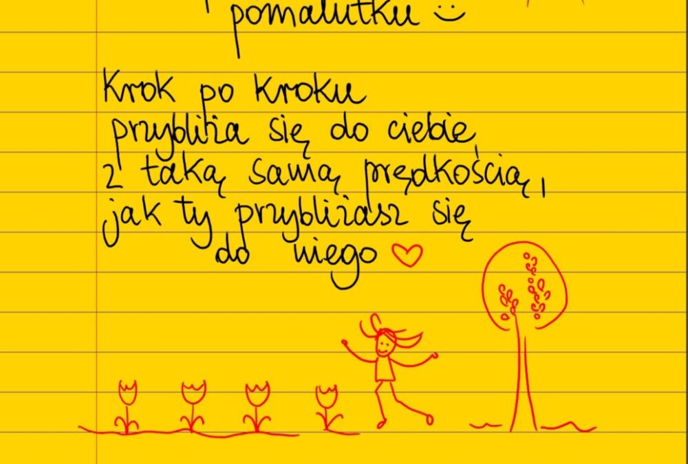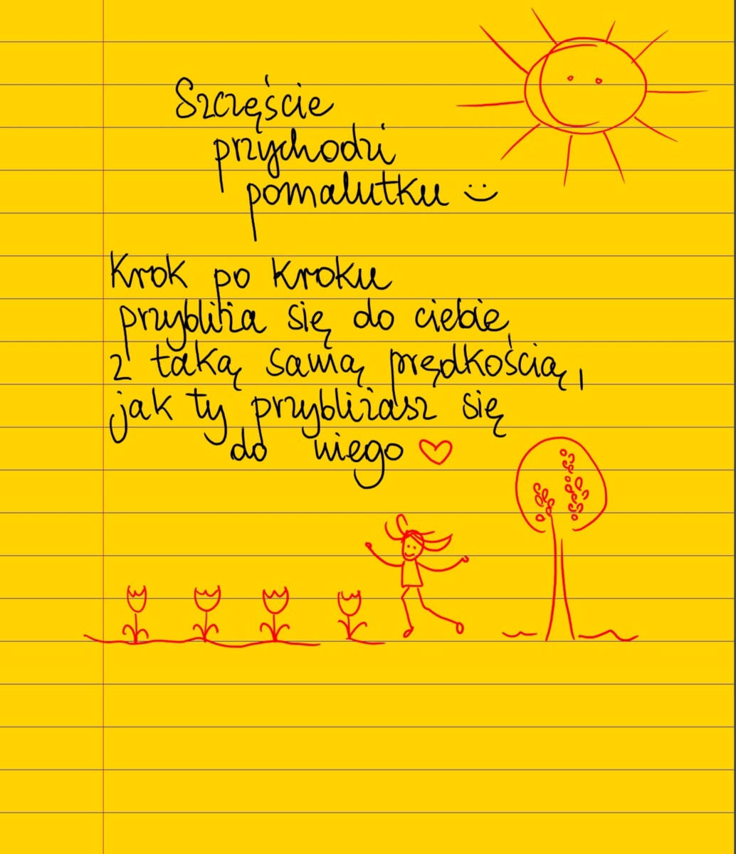 Żółte kartki Szczęście przychodzi pomalutku poniedziałek, 14.03.2022 Szczęście przychodzi pomalutku 🙂 Krok po kroku przybliża się do ciebie z taką samą prędkością, jak ty przybliżasza się do niego 🙂 #żółtakartka Udostępnij na Facebooku