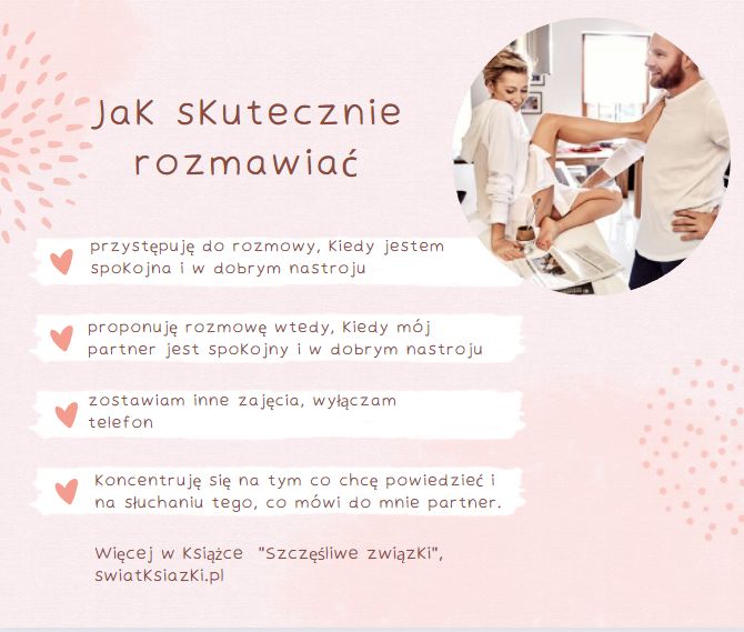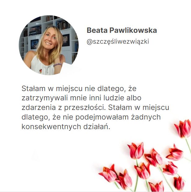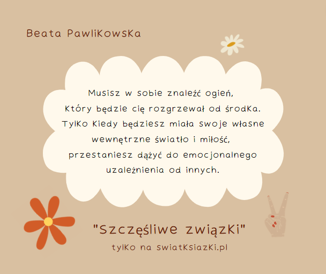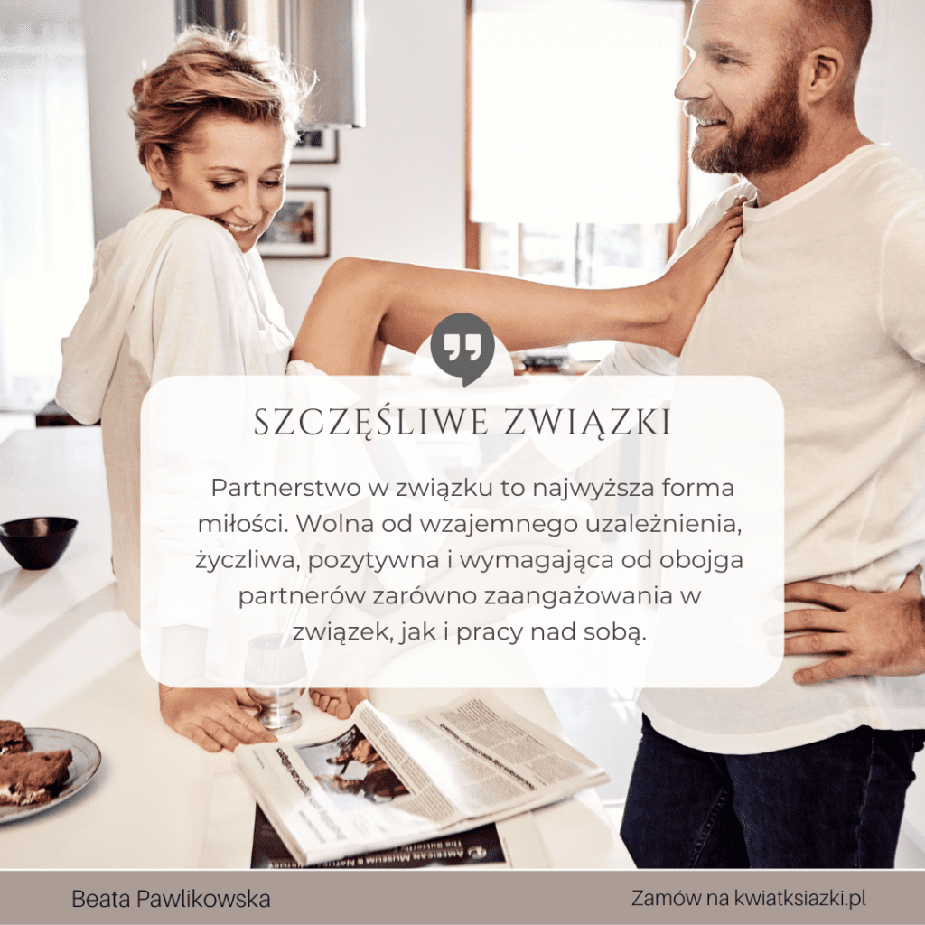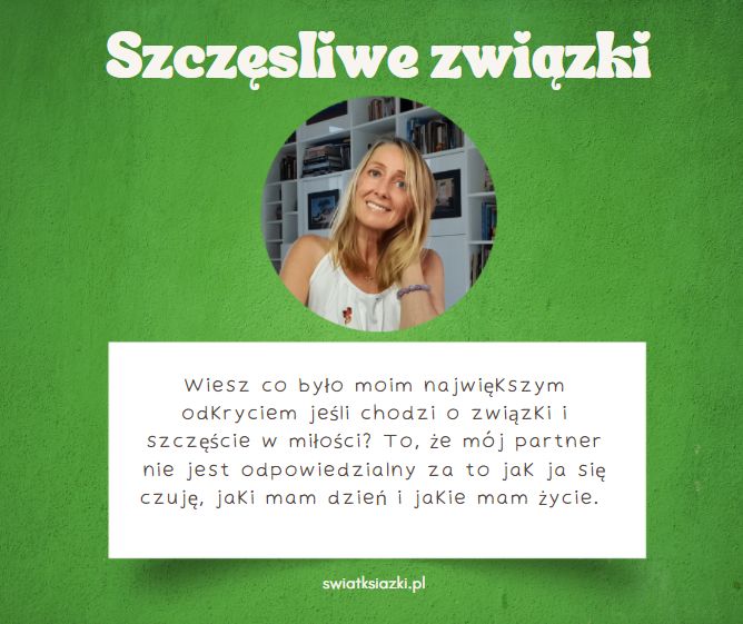 O tym jak stworzyć i wyznaczyć zdrowe granice, o niepewności i zazdrości, o wkurzających nawykach, o nieporozumieniach i konfliktach, a także o tym jak je skutecznie rozwiązywać. O niesamowitej mocy partnerskiej rozmowy i komunikacji. O tym jak przestać być ofiarą w związku. O tym jak odróżnić emocjonalne uzależnienie od miłości. Kompletny przewodnik po asertywności wraz z ćwiczeniami, żeby ją trenować. O szacunku, akceptacji i miłości. O wolności i o toksycznych relacjach. Praktyczny przewodnik przeplatany opowieściami z mojego życia.Obwiniasz kogoś o emocje, jakie się w tobie budzą? Ale halo, przecież to są twoje emocje i one budzą się w tobie, więc kto jeśli nie ty masz na nie największy wpływ? – czytaj dalej.Jeżeli chcesz kiedykolwiek przeprowadzić z kimś partnerską rozmowę, twoja intencja musi być partnerska. Jeżeli chcesz być traktowana w związku jak równoważny partner, ty sama musisz czuć się równorzędnym partnerem.Czytaj dalej.W związku najważniejsza jest przestrzeń. Nie jesteśmy jedną osobą o dwóch głowach. Jesteśmy dwiema indywidualnościami, z których każda jest dorosła i odpowiedzialna za to w jakim kierunku idzie przez życie. Ja zajmuję się moim życiem. Mój partner zajmuje się swoim życiem. Istnieje też duża część wspólna kiedy dzielimy się tym, co robimy razem, co wywołuje w nas obojgu emocje, co jest naszą wspólną pasją albo obowiązkiem. Czytaj dalej.Kiedy jesteś dojrzała emocjonalnie, najbardziej atrakcyjni wydają ci się mężczyzni dojrzali emocjonalnie. Przestają cię pociągać psychopaci, alkoholicy, tchórze, notoryczni kłamcy, oszuści, hazardziści, pracoholicy, dranie, ofiary, maminsynki, desperaci, lenie i faceci, którzy zdradzają. Po prostu instynktownie wtedy czujesz, że to jest ktoś, kto nie pasuje do ciebie.Czytaj dalej.No, moja droga 🙂 Jeżeli twój partner cię obraża, to co ty jeszcze robisz w tym związku? Jeżeli jest człowiekiem stosującym przemoc, to dlaczego swoim zachowaniem okazujesz mu przyzwolenie? Wiem, pewnie mówisz mu, że sobie nie życzysz, że nie pozwalasz, że żądasz szacunku, ale przez fakt pozostawania w nim w związku dajesz mu do zrozumienia, że właściwie jest ci z tym dobrze. Przyjrzyj się swoim czynom. Czy nie jest tak, że nakrzyczysz na niego, wypłaczesz się, zrobisz mu awanturę, a potem innego dnia przytulasz się do niego, dajesz mu do zrozumienia, że go potrzebujesz, kochasz, pragniesz?… – czytaj dalej.Moje usta mówiły: – Nie akceptuję takiego zachowania. Moje zachowanie mówiło: – Akceptuję takie zachowanie i dlatego z tobą jestem – czytaj dalejPartnerska rozmowa może nastąpić tylko w warunkach sprzyjających wzajemnego zrozumieniu: przystępuję do rozmowy kiedy jestem spokojna i w dobrym nastroju, proponuję rozmowę wtedy, kiedy mój partner jest spokojny i w dobrym nastroju, zostawiam inne zajęcia i koncentruję się na tym co chcę powiedzieć i na słuchaniu tego, co mówi do mnie partner.Czytaj dalej.Stałam w miejscu nie dlatego, że zatrzymywali mnie inni ludzie albo zdarzenia z przeszłości. Stałam w miejscu dlatego, że nie podejmowałam żadnych konsekwentnych działań, a kiedy życie mnie do tego zmuszało, szukałam rozwiązania, które byłoby łatwe, szybkie i wygodne zamiast takiego, które przyniosłoby realną, długotrwałą zmianę na lepsze. Czytaj dalejWcześniej rzeczywiście on zawsze był winny. Z wyjątkiem rzadkich sytuacji, kiedy ja naprawdę coś przeskrobałam i on mi udowodnił moją winę, wtedy ja przepraszałam. Ale generalnie on był tym „złym”, a ja byłam ta „dobra”. On się wściekał, ja płakałam. On przepraszał, ja płakałam.Czytaj dalej.Każdy człowiek patrzy na świat trochę inaczej, bo widzi wszystko przez pryzmat swoich wcześniejszych doświadczeń. Dlatego życie jest tak fascynujące. Nie ma dwóch identycznych osób – ani fizycznie, ani mentalnie, ani emocjonalnie. Każdy ma swój świat wewnętrzny i przez jego pryzmat obserwuje i intepretuje to, co dzieje się na zewnątrz. W teorii oczywiście wszyscy o tym wiedzą. Chodzi jednak o to, żeby rozumieć i stosować to także w codziennej praktyce. Bo ja oczywiście wiedziałam, że „każdy człowiek jest inny, bla, bla, bla”, tylko że proces wykonawczy w moim wykonaniu był tak daleki od teorii, jak kłos zboża od bochenka chleba – czytaj dalejPartnerstwo w związku to moim zdaniem najwyższa forma miłości. Wolna od wzajemnego uzależnienia, życzliwa, pozytywna i wymagająca od obojga partnerów zarówno zaangażowania w związek, jak i pracy nad sobą, czyli nieustającej chęci samorozwoju i stawania się lepszym człowiekiem. To ostatnie jest bardzo ważne i ogromnie przydatne w sytuacjach konfliktowych.Mam zaufanie do mojego partnera. Moje zaufanie polega na tym, że szanuję go jako dorosłego człowieka i szanuję jego prawo do samostanowienia. Szanuję jego decyzje i wybory także wtedy kiedy są inne od moich albo kiedy są z moimi sprzeczne. „Szanuję” nie oznacza, że jestem wobec nich bezbronna. Ani że milczę kiedy ktoś robi coś sprzecznego z moim sumieniem. Albo że zgadzam się na coś, co jest dla mnie krzywdzące. Wprost przeciwnie.zanuję jego wolność w takim samym stopniu jak moją. Jeżeli stwierdzam, że moja wolność jako człowieka jest przez partnera ograniczana, to znaczy, że jestem w niewłaściwym związku.Musisz w sobie znaleźć ogień, który będzie cię rozgrzewał od środka. Musisz rozniecić iskrę, zaopiekować się nią i codziennie podsycać. Tylko wtedy kiedy będziesz miała swoje własne wewnętrzne światło, swoją własną wewnętrzną miłość, swoje własne wewnętrzne ciepło, przestaniesz dążyć do emocjonalnego uzależnienia od innych.Trzeba najpierw zrozumieć siebie, poznać siebie, mieć odwagę spojrzeć na siebie z totalną uczciwością, znaleźć o sobie prawdę, przyznać się do niej, docenić sw