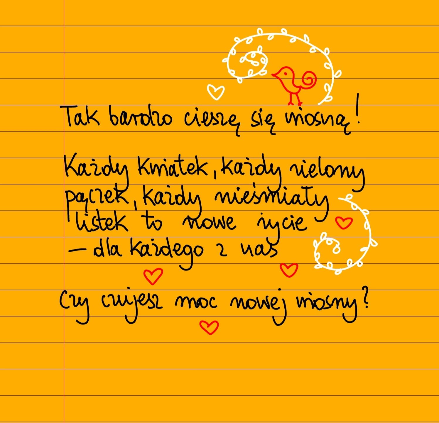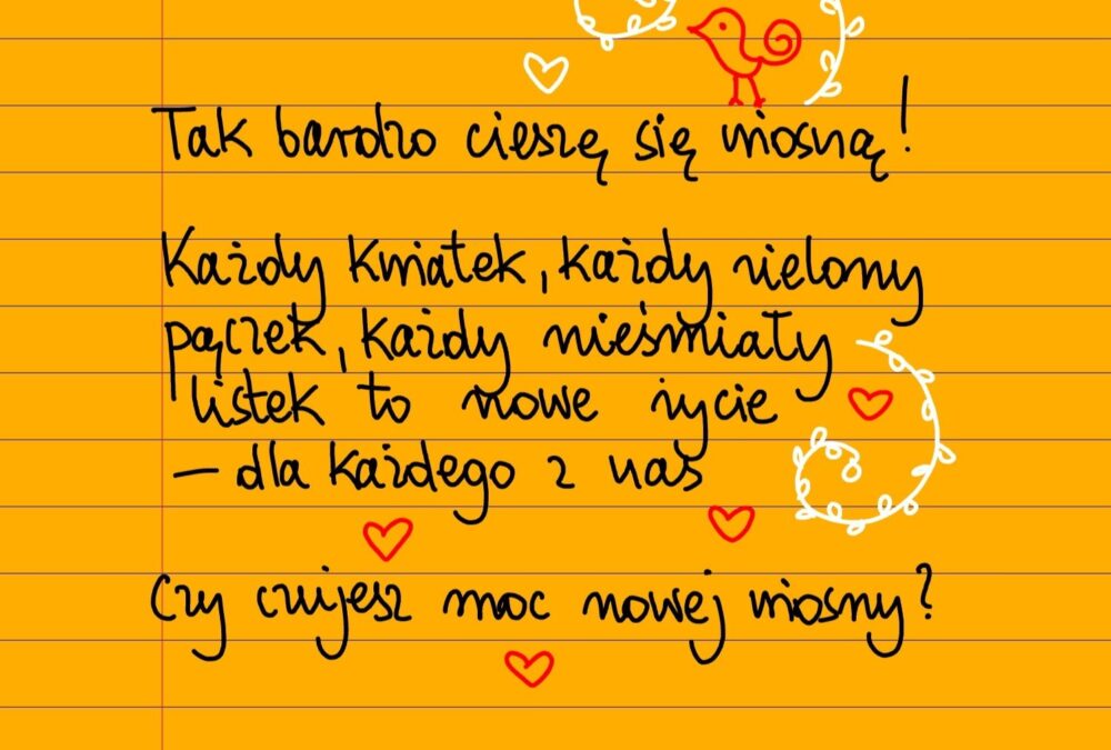 Żółte kartki Tak bardzo cieszę się wiosną poniedziałek, 14.04.2025 Tak bardzo cieszę się wiosną! Każdy kwiatek, każdy zielony pączek, każdy nieśmiały listek to nowe życie, dla każdego z nas. Czy czujesz moc nowej wiosny? ❤ Udostępnij na Facebooku