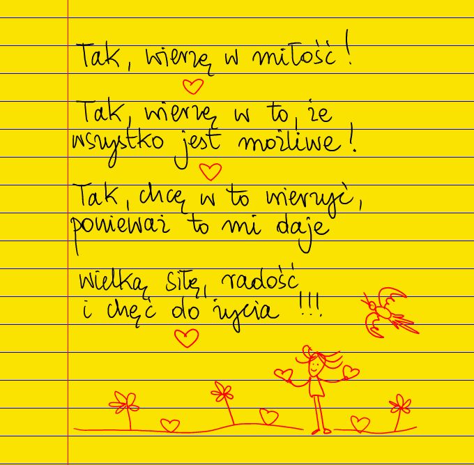 Żółte kartki Tak, wierzę w miłość! poniedziałek, 26.02.2024 Tak, wierzę w miłość! ❤ Tak, wierzę w to, że wszystko jest możliwe! ❤ Tak, chcę w to wierzyć, ponieważ to mi daje wielką siłę, radość i chęć do życia! ❤ #żółtakartka Udostępnij na Facebooku