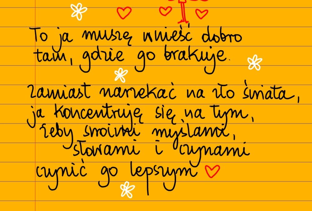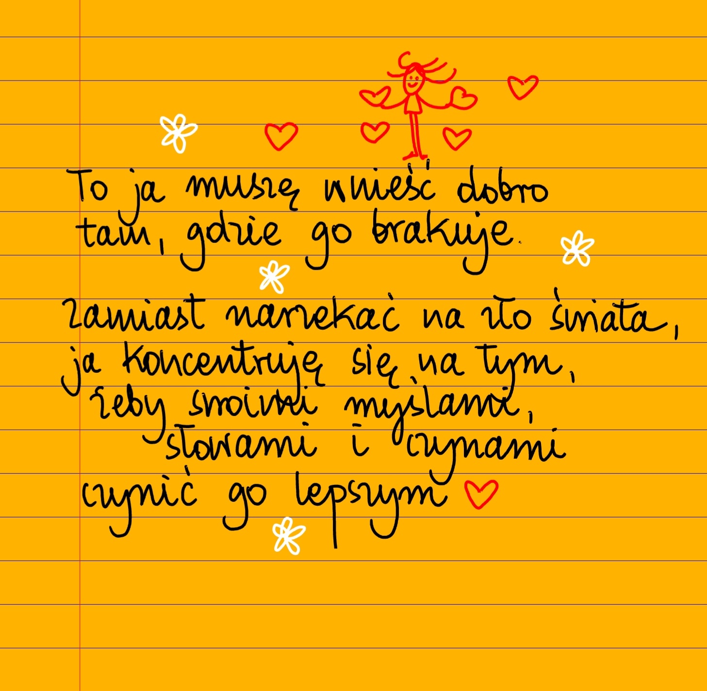 To ja muszę wnieść dobro tam, gdzie go brakuje. Zamiast narzekać na zło świata, ja koncentruję się na tym, żeby swoimi myślami, słowami i czynami czynić go lepszym ❤