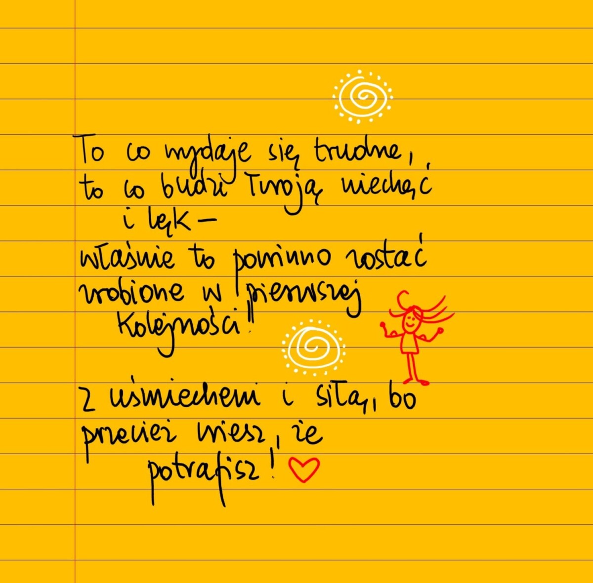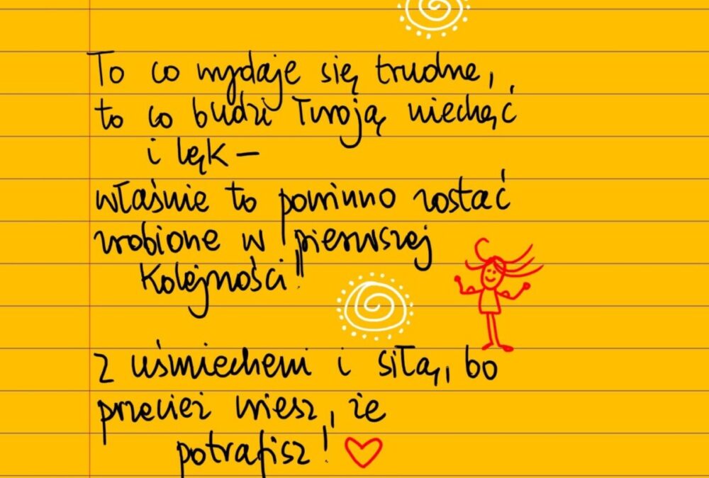 Żółte kartki To co trudne środa, 16.11.2022 To co wydaje się trudne, to co budzi twoją niechęć i lęk – właśnie to powinno zostać zrobione w pierwszej kolejności. Z uśmiechem i siłą, bo przecież wiesz, że potrafisz 😀❤ #żółtakartka Udostępnij na Facebooku