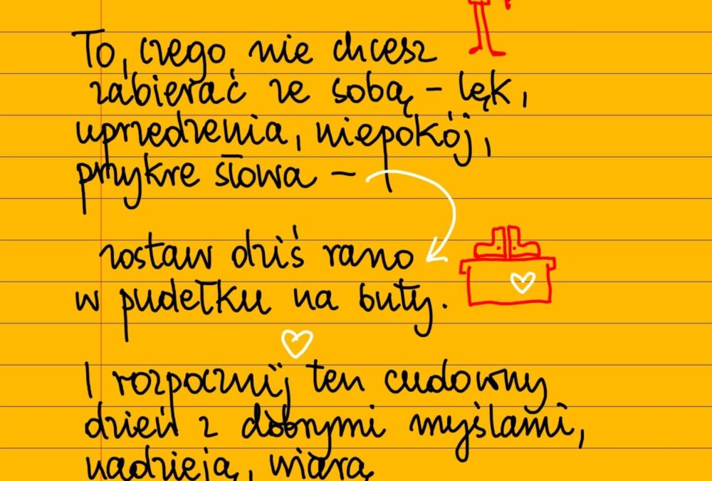 To czego nie chcesz zabierać ze sobą – lęk, uprzedzenia, niepokój, złe słowa, przykre wspomnienia – zostaw dziś rano w pudełku na buty. Jeśli będziesz chciała do nich wrócić, zrób to dopiero wieczorem. A teraz rozpocznij ten cudowny dzień z dobrymi myślami, nadzieją, wiarą i uśmiechem. #żółtakartka