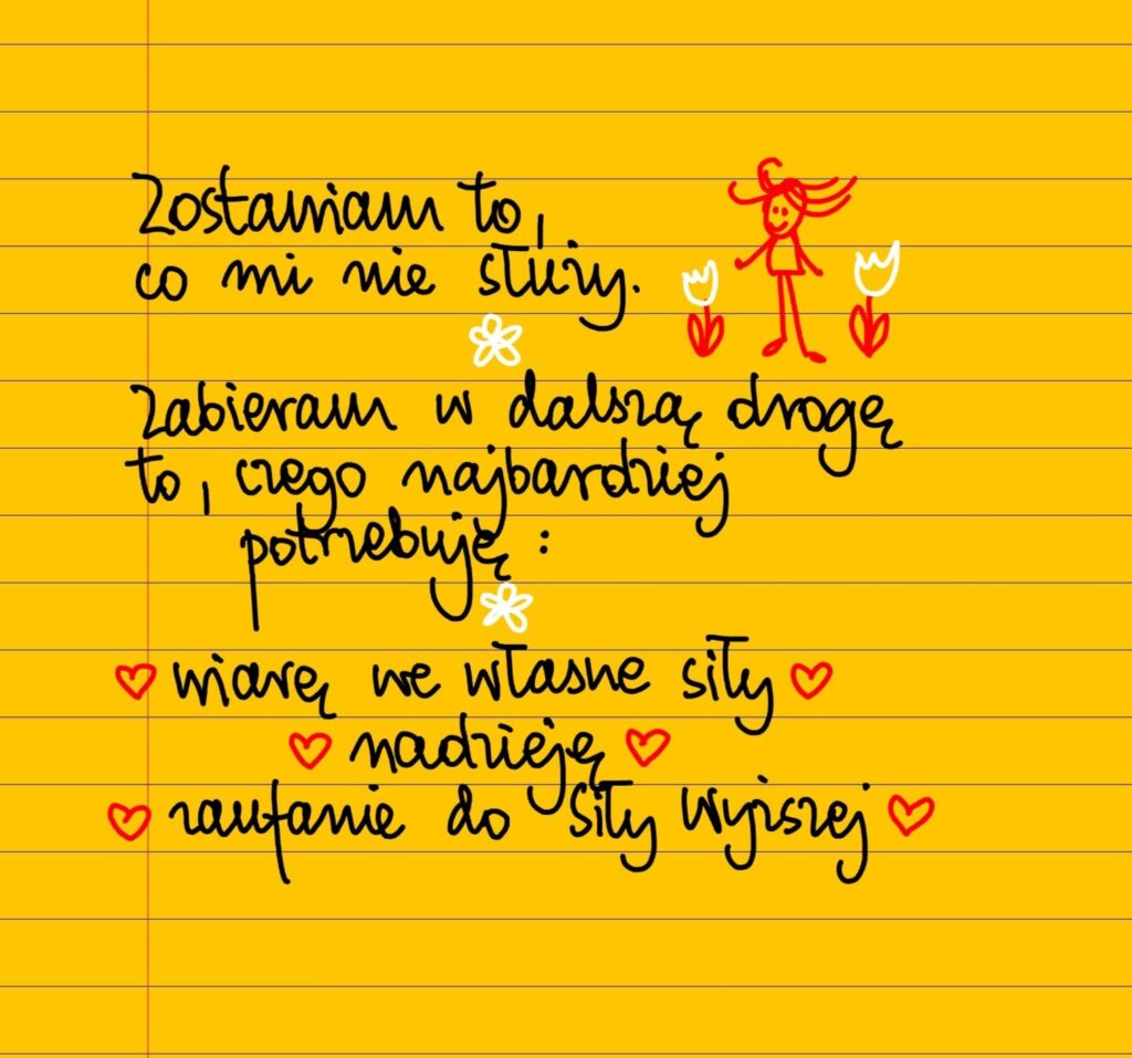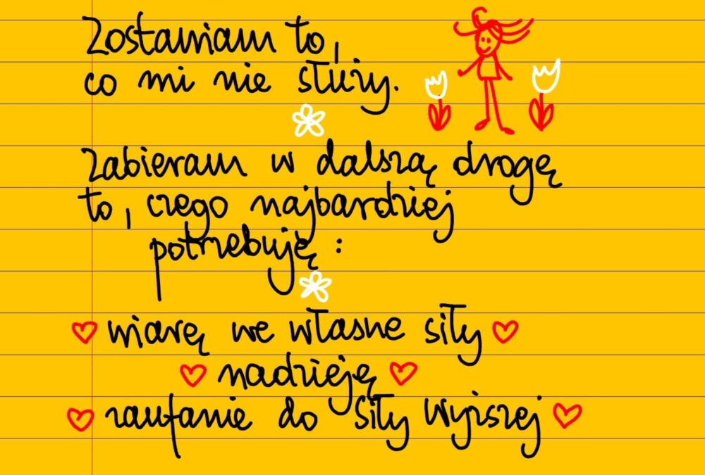 Żółte kartki To czego potrzebuję czwartek, 06.04.2023 Zostawiam to, co mi nie służy. Zabieram w dalszą drogę to, czego najbardziej potrzebuję: wiarę we własne siły, nadzieję i zaufanie do Siły Wyższej. #żółtakartka Udostępnij na Facebooku