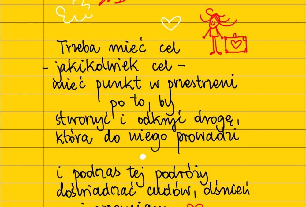 Żółte kartki Trzeba mieć cel środa, 06.12.2023 Trzeba mieć cel – jakikolwiek cel. Mieć punkt w przestrzeni po to, żeby stworzyć i odkryć drogę, która do niego prowadzi i podczas tej podróży doświadczać cudów, olśnieni i przemiany ❤ #żółtakartka Udostępnij na Facebooku