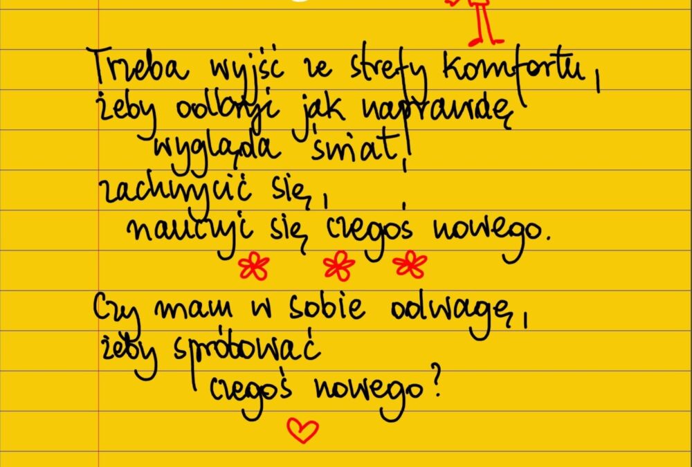 Żółte kartki Trzeba wyjść ze strefy komfortu poniedziałek, 12.08.2024 Trzeba wyjść ze strefy komfortu, żeby odkryć jak naprawdę wygląda świat, zachwycić się, nauczyć się czegoś nowego. Czy mam w sobie odwagę, żeby spróbować czegoś nowego? #żółtakartka #beatapawlikowska Udostępnij na Facebooku