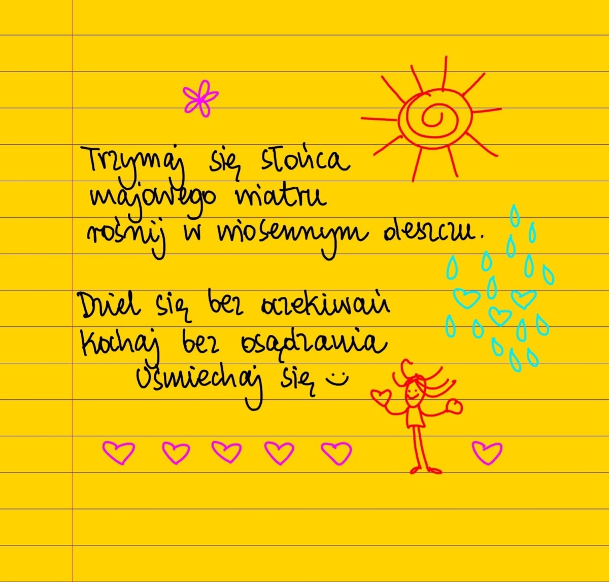 Żółte kartki Trzymaj się słońca piątek, 21.05.2021 Trzymaj się słońca, majowego wiatru, rośnij w wiosennym deszczu. Dziel się bez oczekiwań, kochaj bez osądzania. Uśmiechnij się 😊 #żółtakartka Udostępnij na Facebooku