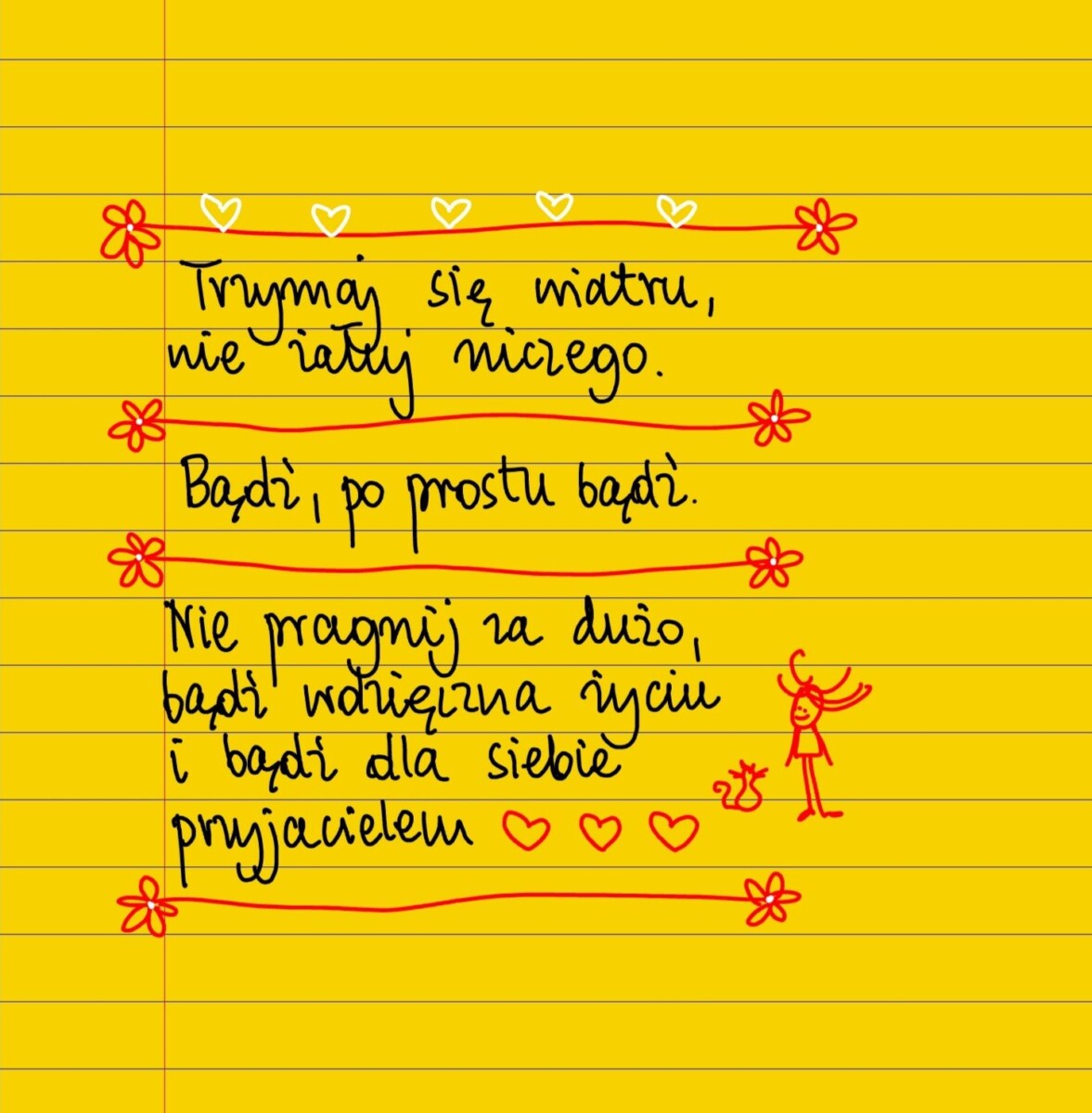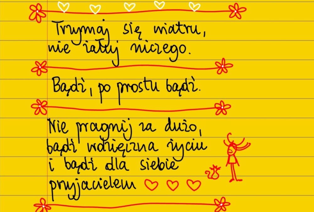 Żółte kartki Trzymaj się wiatru piątek, 02.07.2021 Trzymaj się wiatru, nie żałuj niczego. Bądź, po prostu bądź. Nie pragnij za dużo, bądź wdzięczna życiu i bądź dla siebie przyjacielem. #żółtakartka Udostępnij na Facebooku