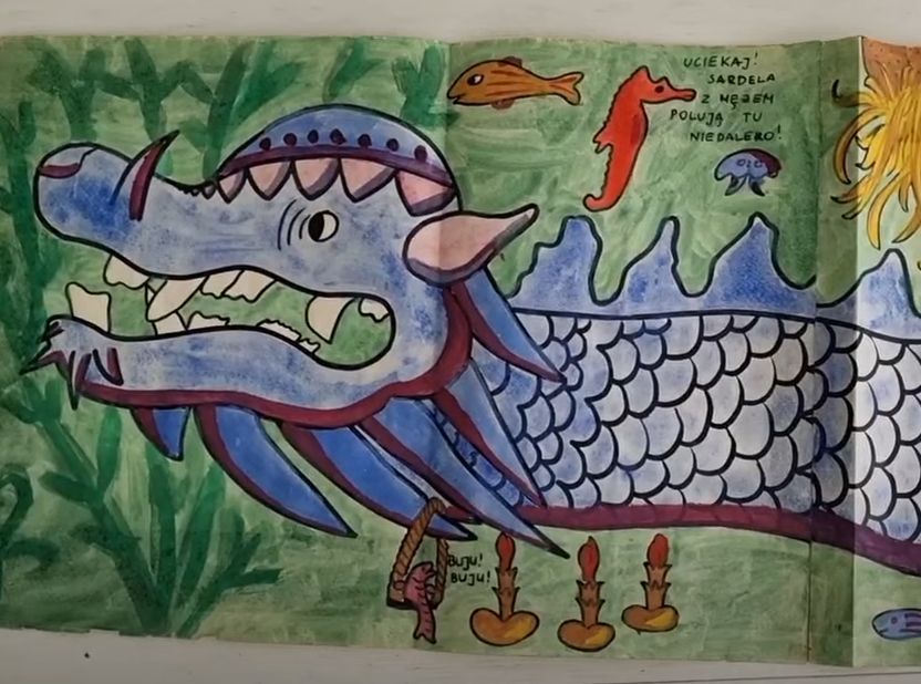 Ten rysunek ma trzy metry długości 😊 Narysowałam go wiele lat temu, może w 1983 lub 1984 roku. Kilka dni temu mój Tata znalazł go przez przypadek w szafie w Koszalinie i przysłał do mnie 😊 Widzę go dzisiaj jakbym widziała go po raz pierwszy, zupełnie zapomniałam, że narysowałam kiedyś taką podwodną trzymetrową przygodę 😊😊