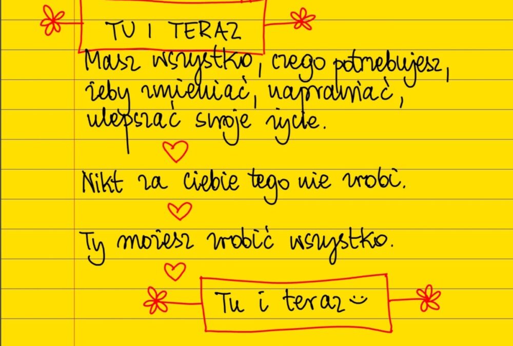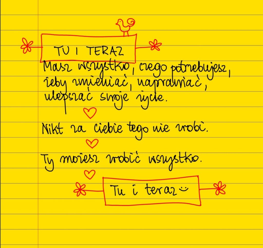 TU I TERAZ. Masz wszystko, czego potrzebujesz, żeby zmieniać, naprawiać, ulepszać swoje życie. Nikt za Ciebie tego nie zrobi. Ty możesz zrobic wszystko. Tu i teraz. #żółtakartka