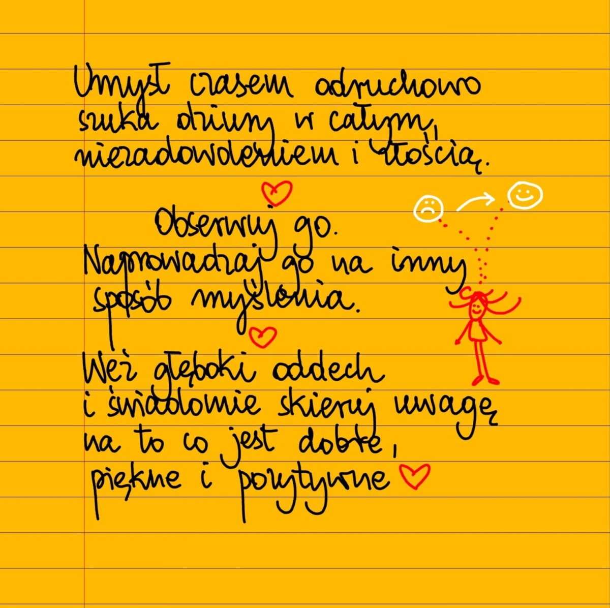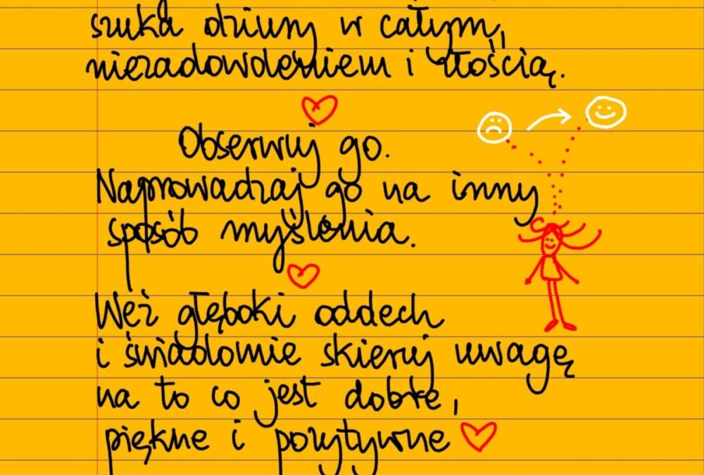 Umysł czasem odruchowo zajmuje się szukaniem dziury w całym, niezadowoleniem i złością. Obserwuj go. Naprowadzaj go na inny sposób myślenia. Weź głęboki oddech i świadomie skieruj uwagę na to, co jest piękne, dobre, potrzebne, pozytywne. #żółtakartka