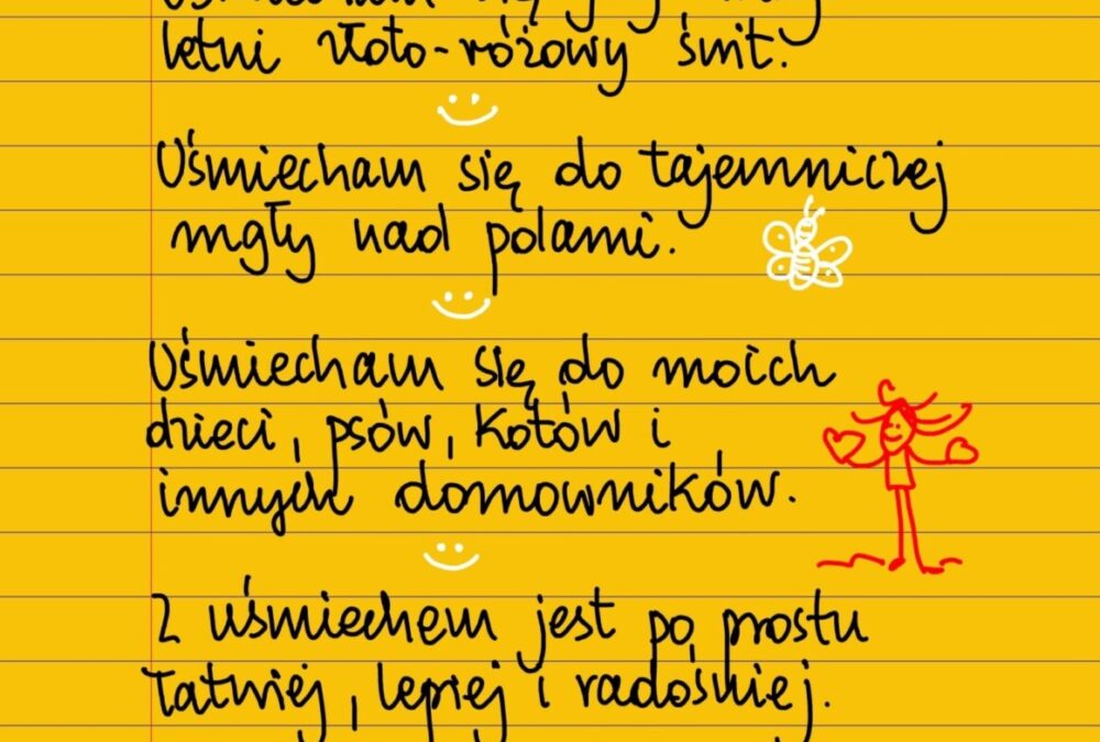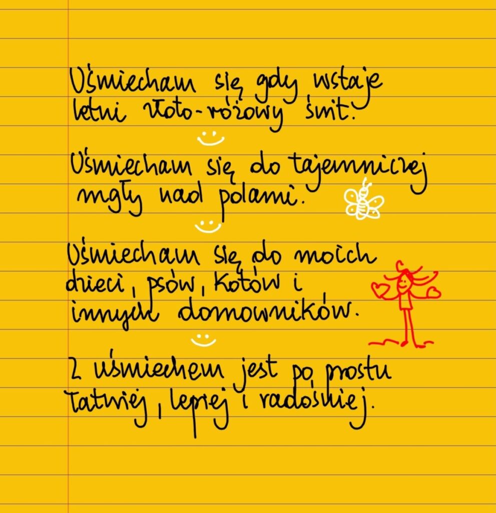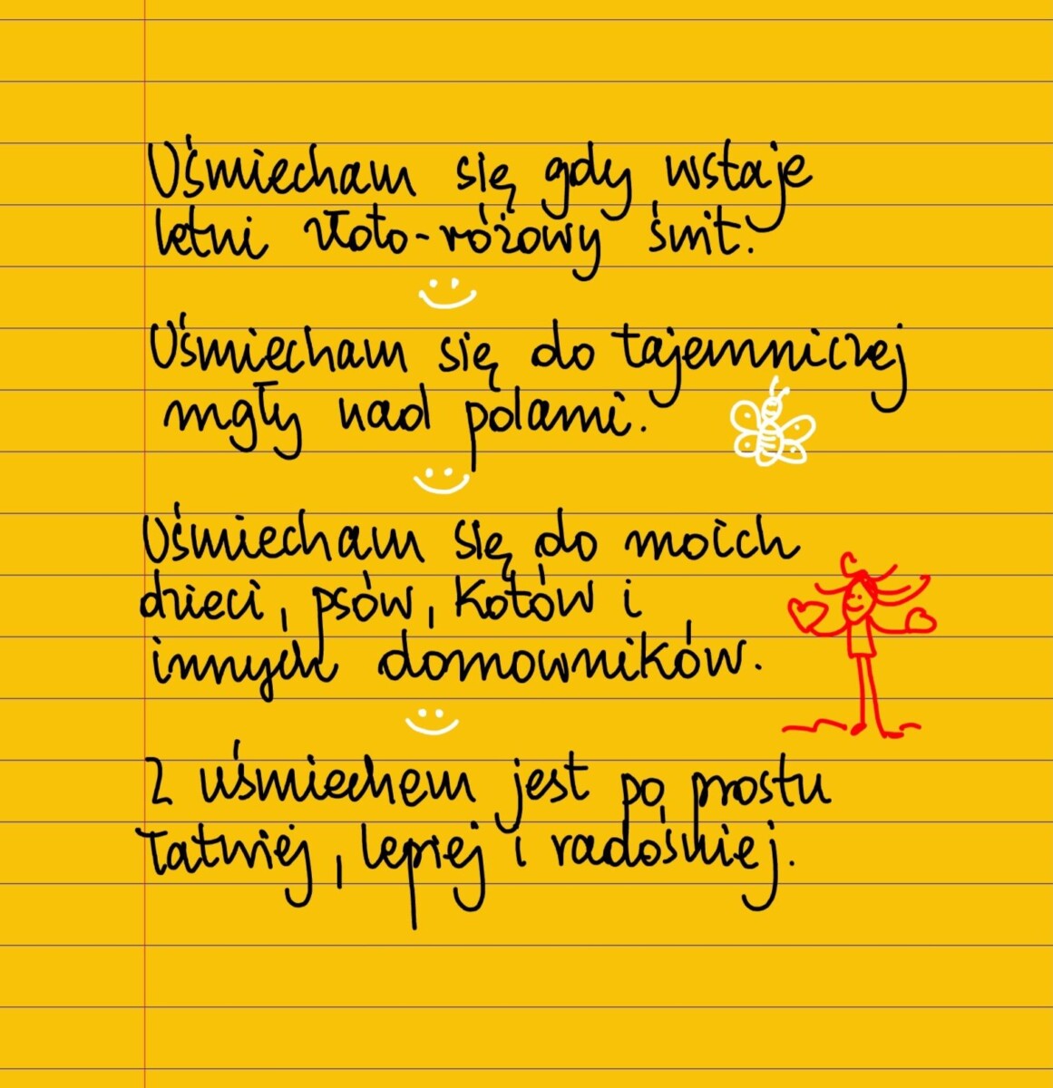 Żółte kartki Uśmiecham się poniedziałek, 06.06.2022 Uśmiecham się gdy wstaje złoto-różowy świt. Usmiecham się do tajemniczej mgły nad polami. Uśmiecham się do moich dzieci, psów, kotów i innych domowników. Z uśmiechem jest po prostu łatwiej, lepiej i radośniej. #żółtakartka Udostępnij na Facebooku