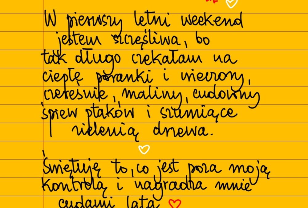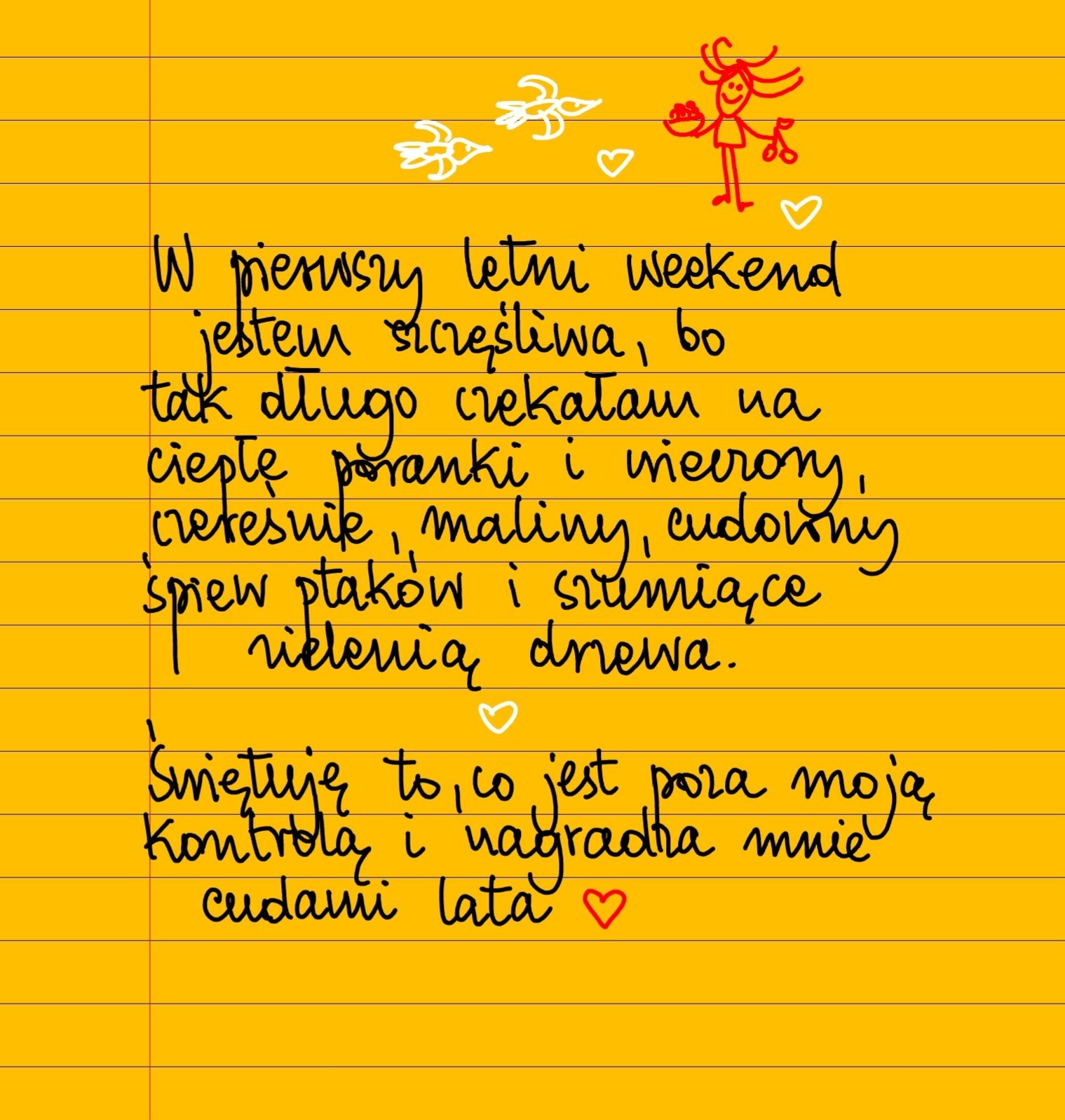 W pierwszy letni weekend jestem szczęśliwa, bo tak długo czekałam na ciepłe poranki i wieczory, czereśnie, maliny, cudowny śpiew ptaków i szumiące zielenią drzewa. W ten weekend świętuję to, co jest poza moją kontrolą i nagradza mnie cudami lata ❤ #żółtakartka #beatapawlikowska