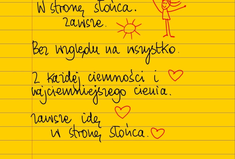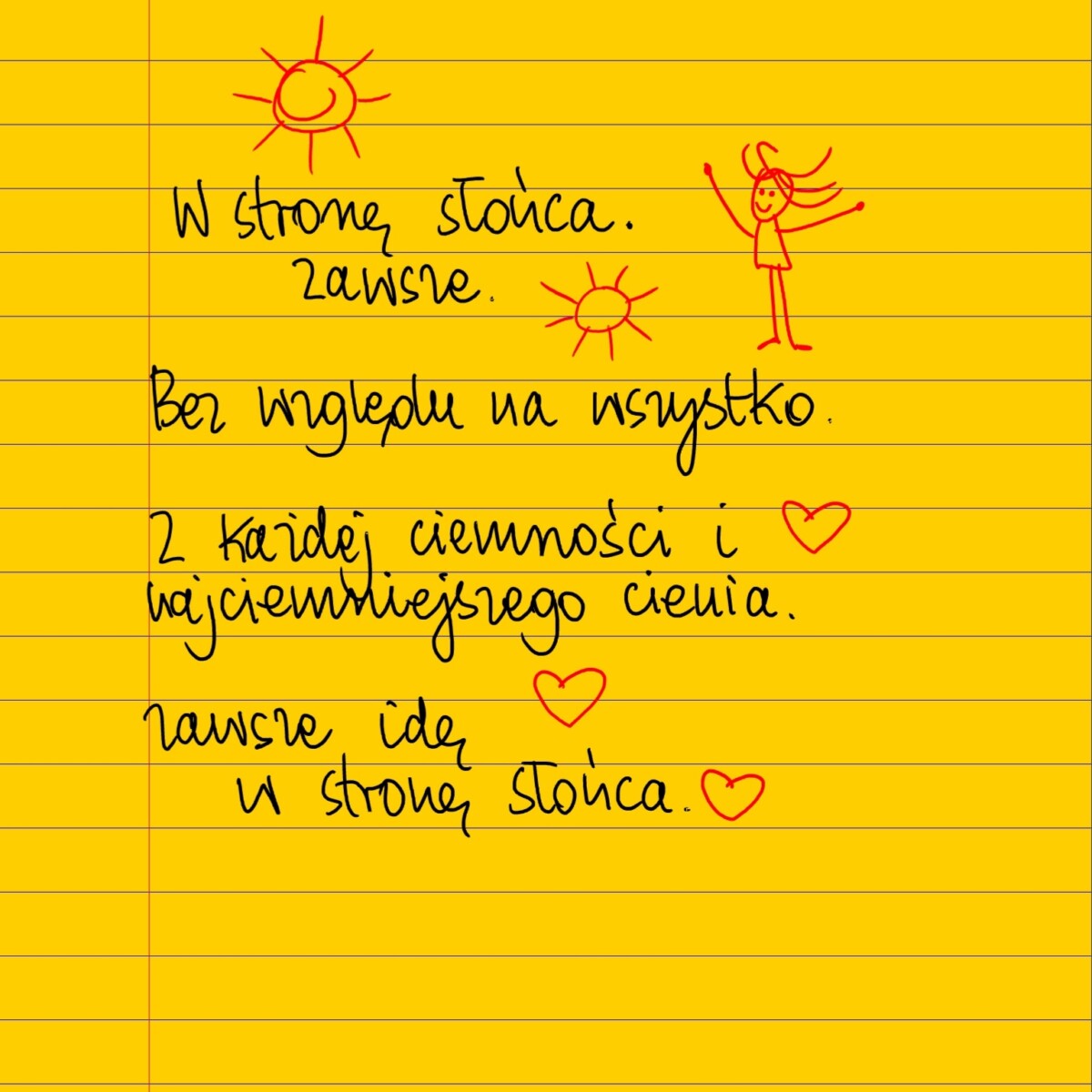 Żółte kartki W stronę słońca poniedziałek, 07.03.2022 W stronę słońca. Zawsze. Bez względu na wszystko. Z każdej ciemności i z najciemniejszego cienia. Zawsze idę w stronę słońca. #żółtakartka Udostępnij na Facebooku
