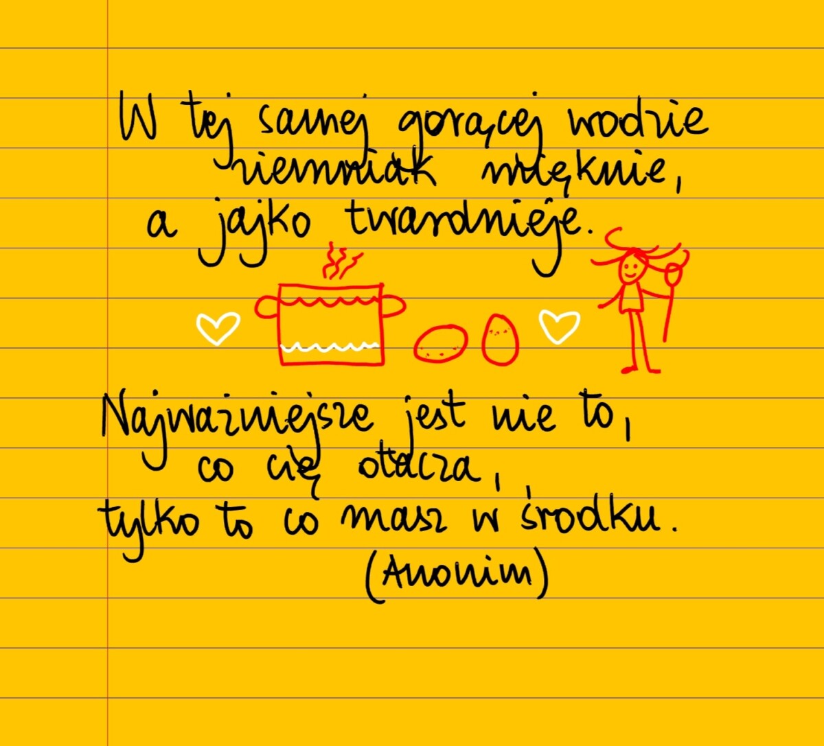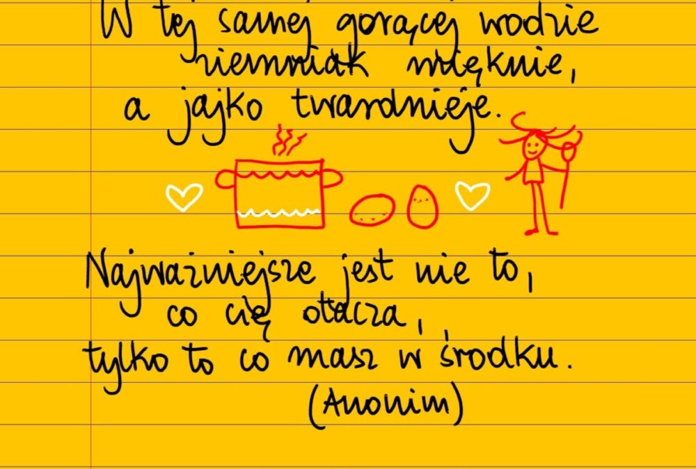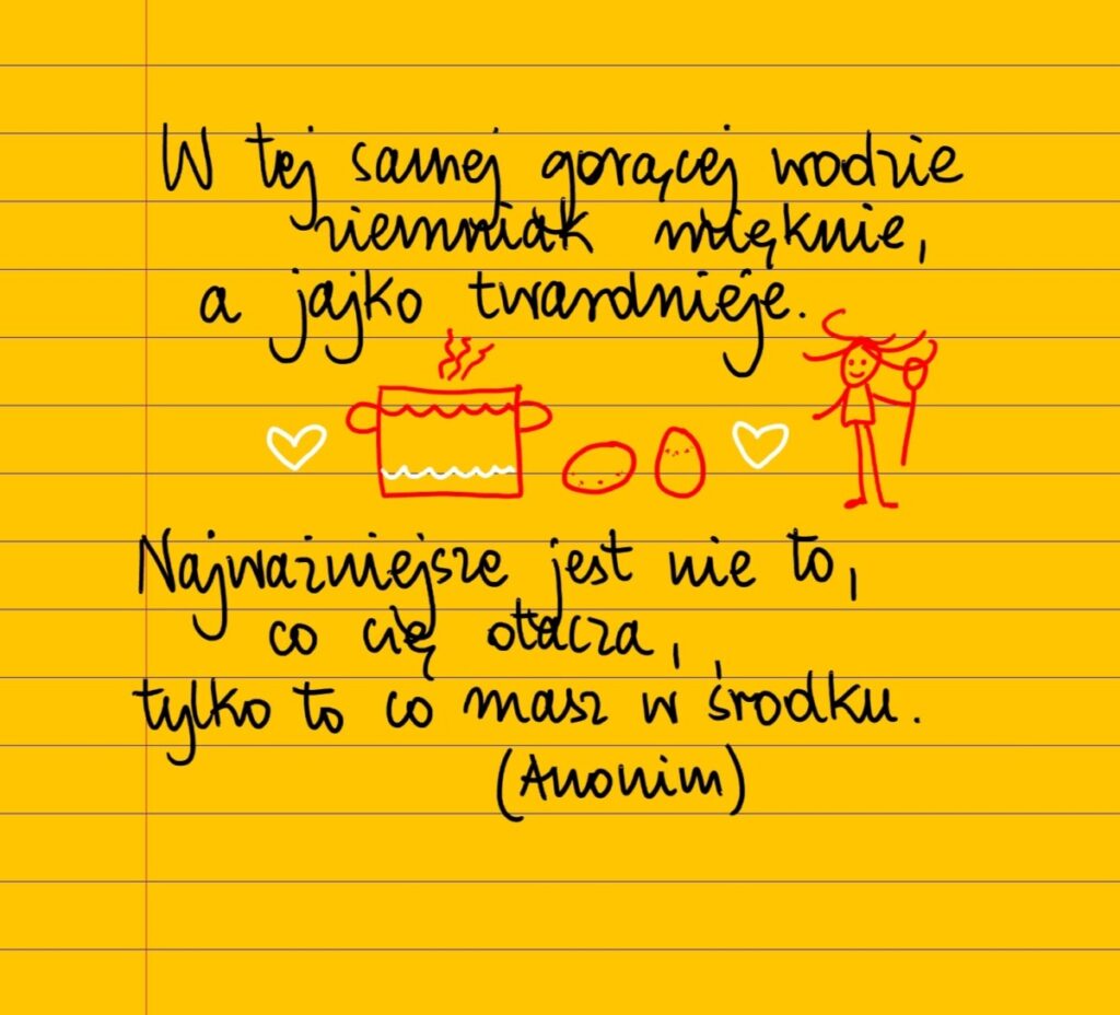 Żółte kartki W tej samej gorącej wodzie środa, 05.10.2022 W tej samej gorącej wodzie ziemniak mięknie, a jajko twardnieje. Najważniejsze jest nie to co cię otacza, tylko to co masz w środku. (Anonim.) #żółtakartka Udostępnij na Facebooku