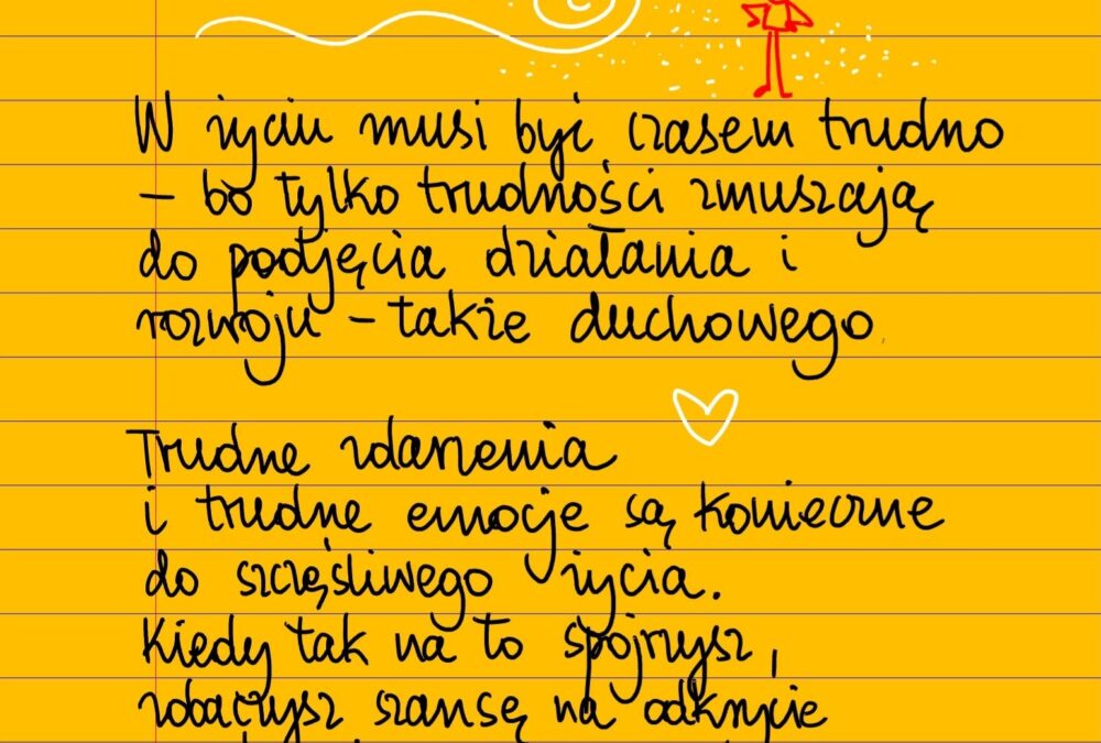 W życiu musi być czasem trudno, bo tylko trudności zmuszają do wyjścia ze strefy komfortu, podjęcia działania i rozwoju – zarówno fizycznego, jak i mentalnego oraz duchowego. Trudne zdarzenia i trudne emocje są konieczne do szczęśliwego życia. Kiedy spojrzysz na to z takiej perspektywy, zupełnie inaczej podejdziesz do przeciwności i problemów. Będziesz w nim widział szansę na przyśpieszenie rozwoju, znalezienie czegoś ważnego, osiągnięcie wyższego poziomu. #żóltakartka #beatapawlikowska