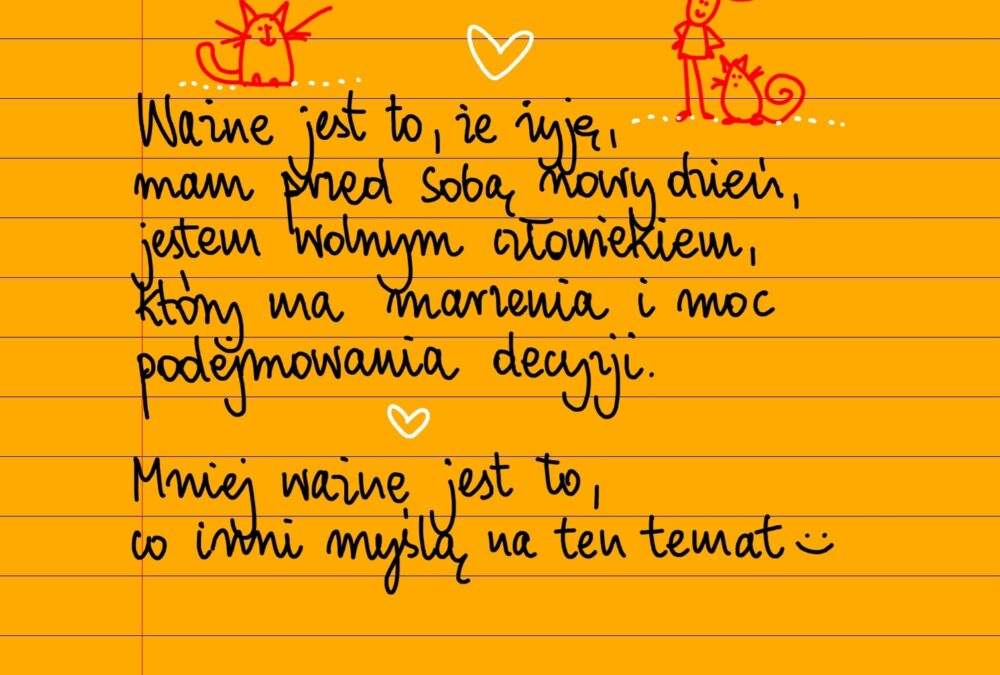Żółte kartki Ważne jest to, że żyję czwartek, 30.01.2025 Ważne jest to, że żyję, mam przed sobą nowy dzień, jestem wolnym człowiekiem, który ma marzenia i moc podejmowania decyzji. Mniej ważne jest to co inni myślą na ten temat ❤ Udostępnij na Facebooku