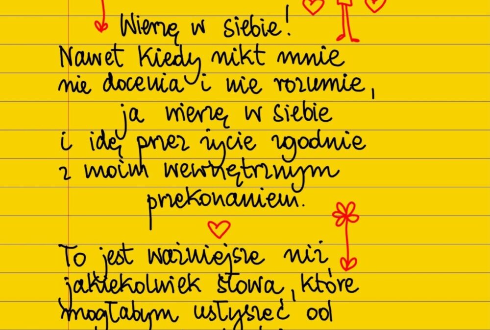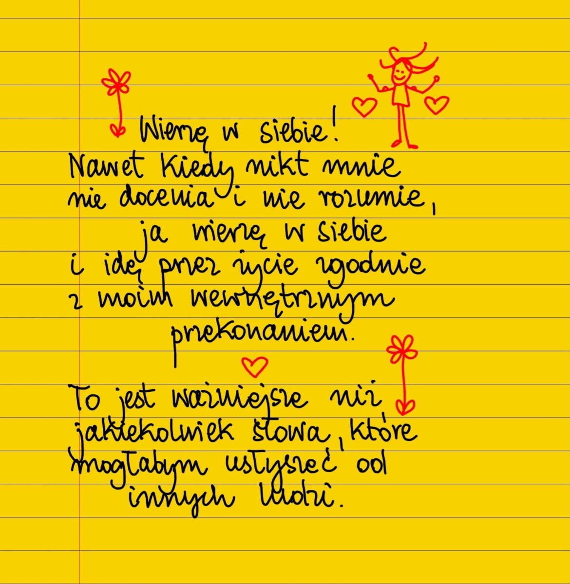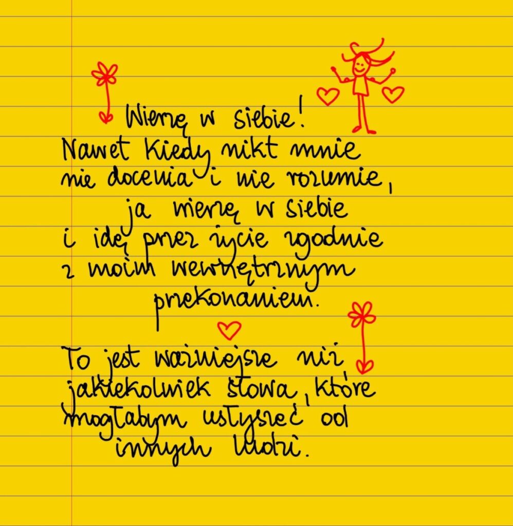Żółte kartki Wierzę w siebie! czwartek, 21.04.2022 Wierzę w siebie!!! Nawet kiedy nikt mnie nie docenia i nie rozumie, ja wierzę w siebie i podążam przez życie zgodnie z moim wewnętrznym przekonaniem. To jest ważniejsze niż jakiekolwiek słowa, które mogłabym usłyszeć od innych ludzi. #żółtakartka Udostępnij na Facebooku