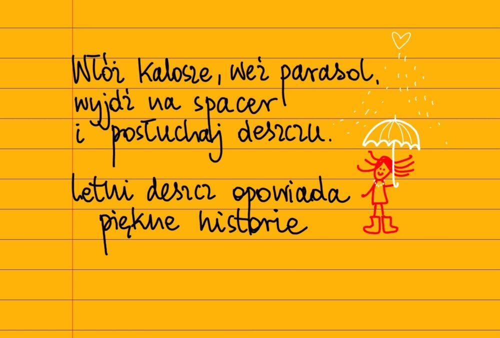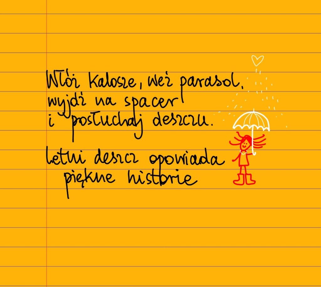 Żółte kartki Włóż kalosze, weź parasol i wyjdź na spacer czwartek, 10.07.2025 📍Włóż kalosze, weź parasol i wyjdź na spacer. Niech letni deszcz Cię poprowadzi 🌧️ Każda kropla to inna opowieść – trzeba tylko zwolnić i posłuchać. Może usłyszysz coś, czego potrzebujesz? Udostępnij na Facebooku