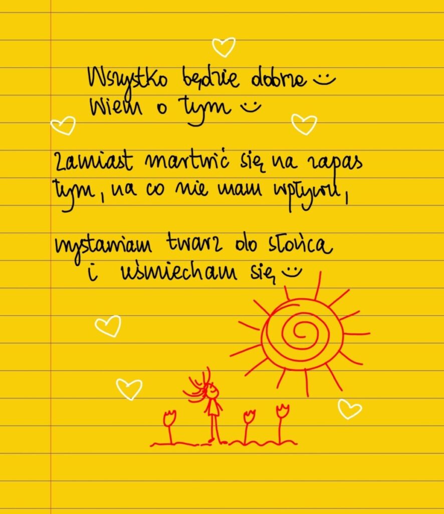 Żółte kartki Wszystko będzie dobrze 😀 wtorek, 11.05.2021 Wszystko będzie dobrze 😀 Wiem o tym 😀 Zamiast martwić się na zapas tym, na co nie mam wpływu, wystawiam twarz do słońca i uśmiecham się 😀 #żóltakartka Udostępnij na Facebooku