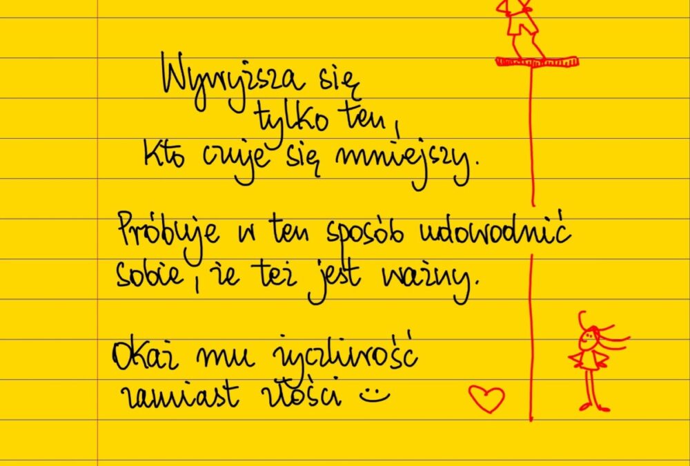 Wywyższa się tylko ten, kto czuje się mniejszy. Próbuje w ten sposob udowodnić sobie, że też jest ważny. Okaż mu życzliwość zamiast złości 😀 #żółtakartka