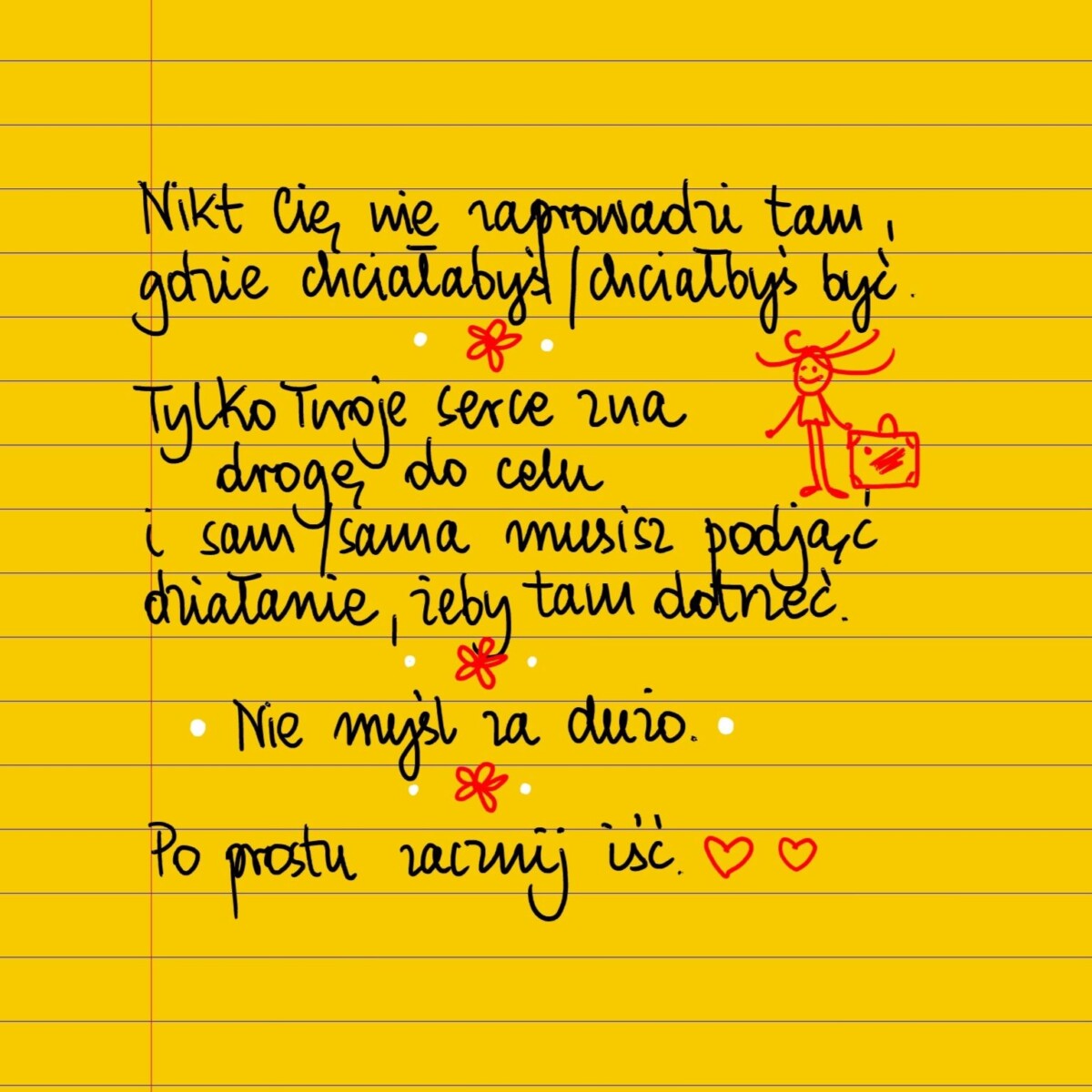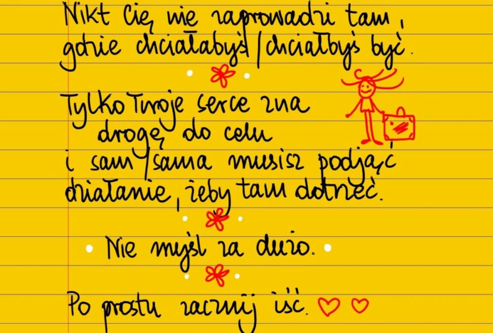 Żółte kartki Zacznij iść czwartek, 27.11.2025 Nikt cię nie zaprowadzi tam gdzie chciałabyś być. Tylko twoje serce zna drogę do celu i sama musisz podjąć działanie, żeby tam dotrzeć. Nie myśl za dużo. Po prostu zacznij iść. #żółtakartka Udostępnij na Facebooku