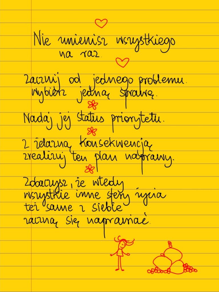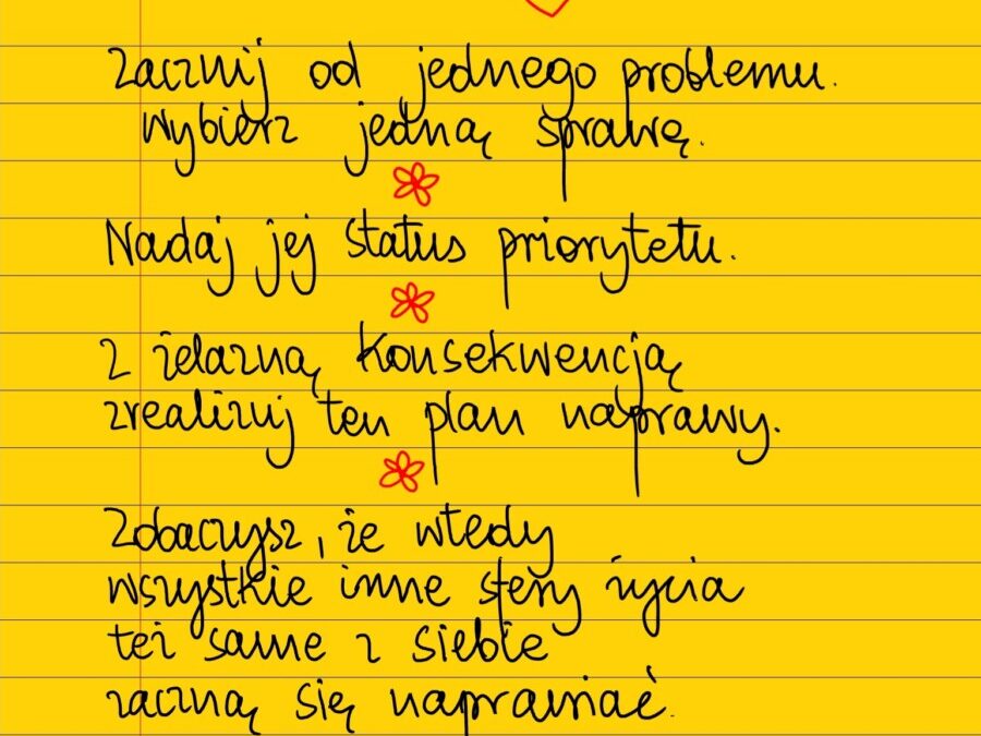 Nie zmienisz wszystkiego na raz. Zacznij od jednego problemu. Wybierz jedną sprawę. Nadaj jej status priorytetu. Z żelazną konsekwencją zrealizuj ten plan naprawy. Zobaczysz, że wtedy wszystkie inne sfery życia też same z ziebie zaczną się naprawiać. #żółtakartka