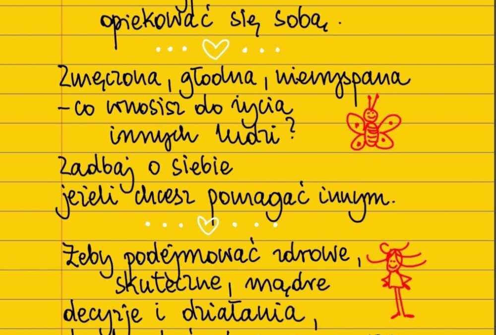 Żeby opiekować się innymi, musisz najpierw zaopiekować się sobą. Zmęczona, głodna, niewyspana – co wnosisz do życia innych ludzi? Zadbaj o siebie jeżeli chcesz pomagać innym. Żeby podejmować zdrowe, skuteczne, mądre decyzje i działania, trzeba być zdrowym, wyspanym, zrównoważonym wewnętrznie człowiekiem. #żółtakartka