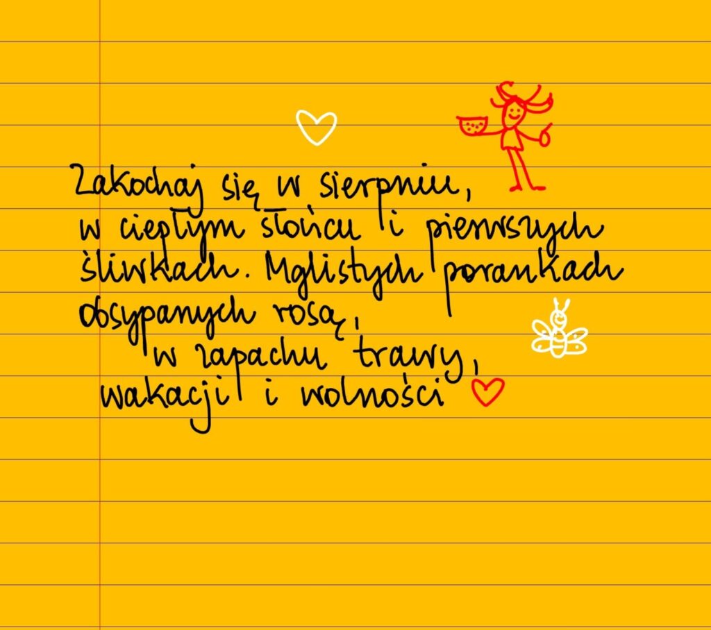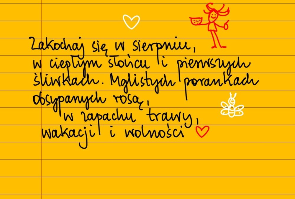 Żółte kartki Zakochaj się w sierpniu piątek, 08.08.2025 Zakochaj się w sierpniu, w ciepłym słońcu i pierwszych śliwkach. W mglistych porankach obsypanych rosą, w zapachu trawy, wakacji i wolności. Udostępnij na Facebooku