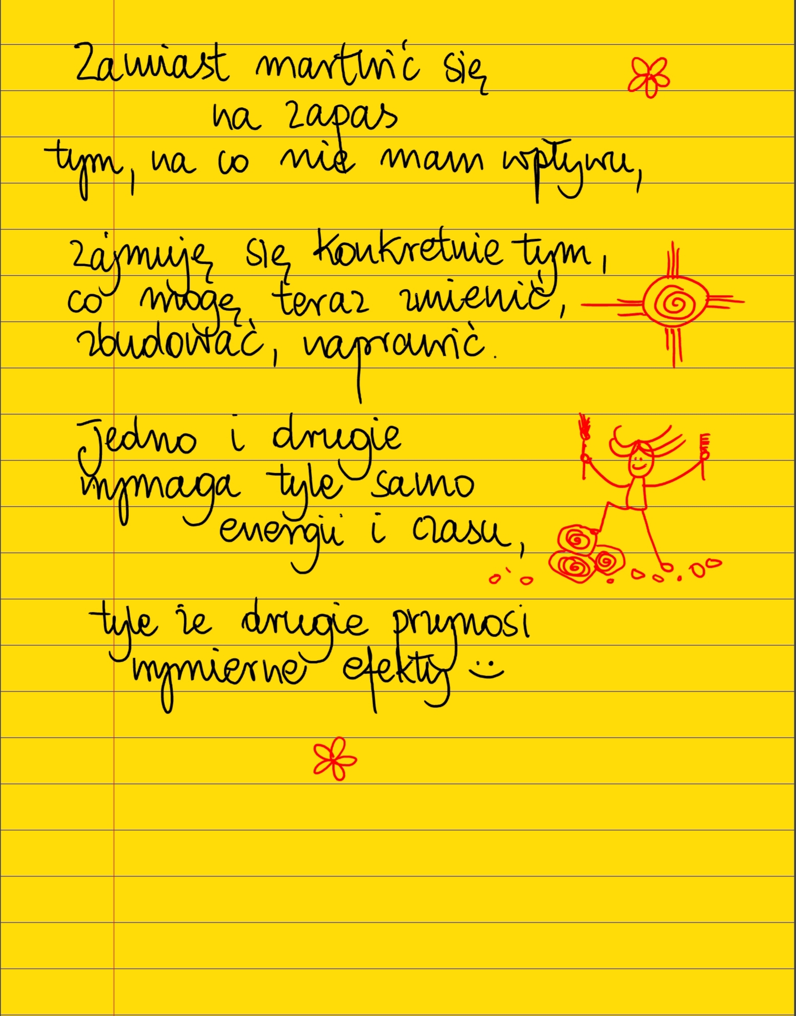 Żółte kartki Zamiast czwartek, 16.11.2023 Zamiast martwić się na zapas tym, na co nie mam wpływu, zajmuję się konkretnie tym, co mogę teraz zmienić, zbudować, naprawić. Jedno i drugie wymaga tyle samo czasu i energii, tyle że drugie przynosi wymierne efekty ❤ #żółtakartka Udostępnij na Facebooku