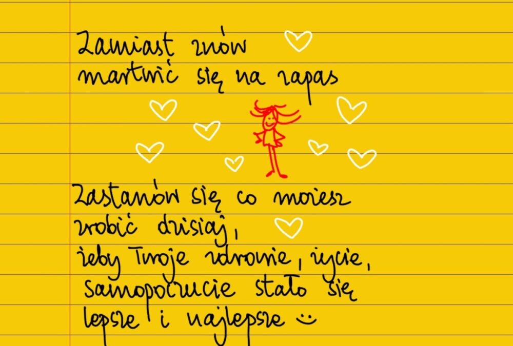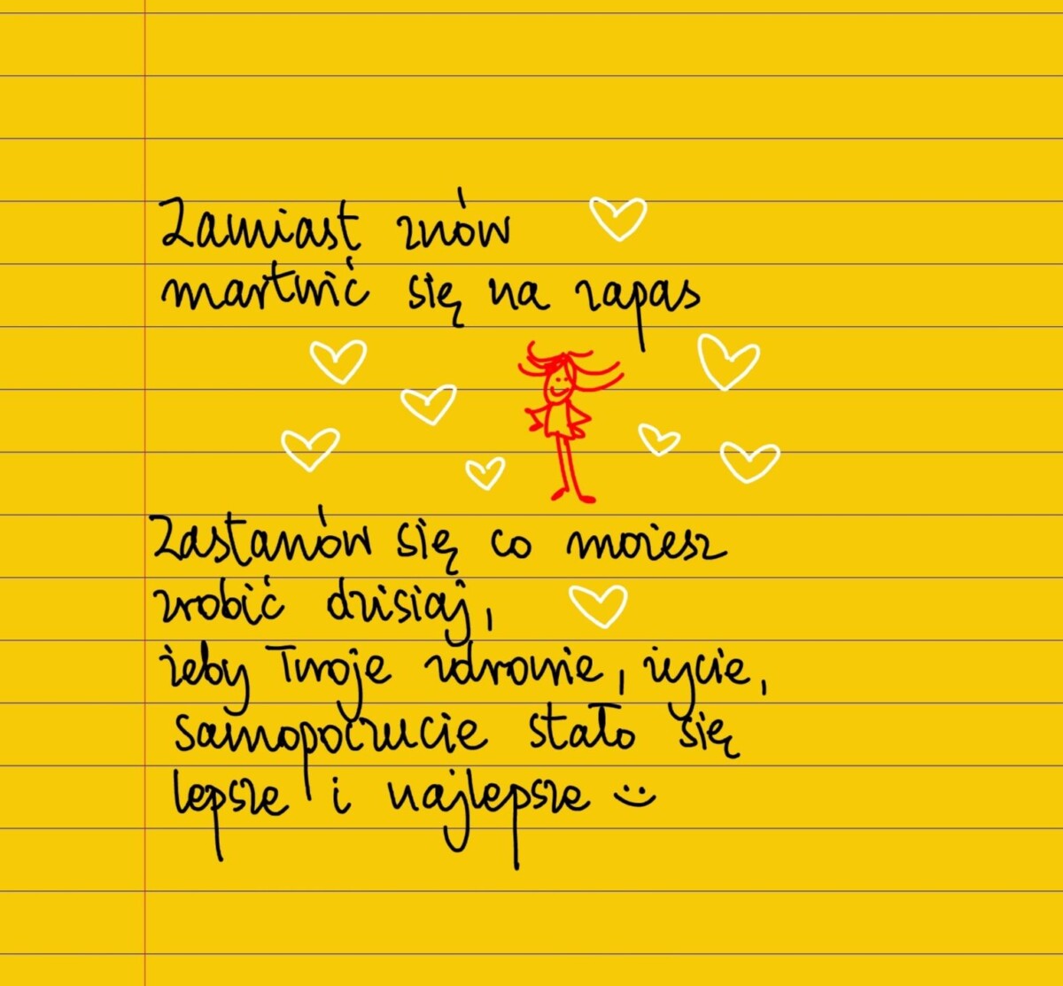 Żółte kartki Zamiast martwić się na zapas środa, 26.10.2022 Zamiast znów martwić się na zapas – zastanów się co możesz zrobić dzisiaj, żeby Twoje zdrowie, życie, samopoczucie stało się lepsze i najlepsze 🙂 #żółtakartka Udostępnij na Facebooku