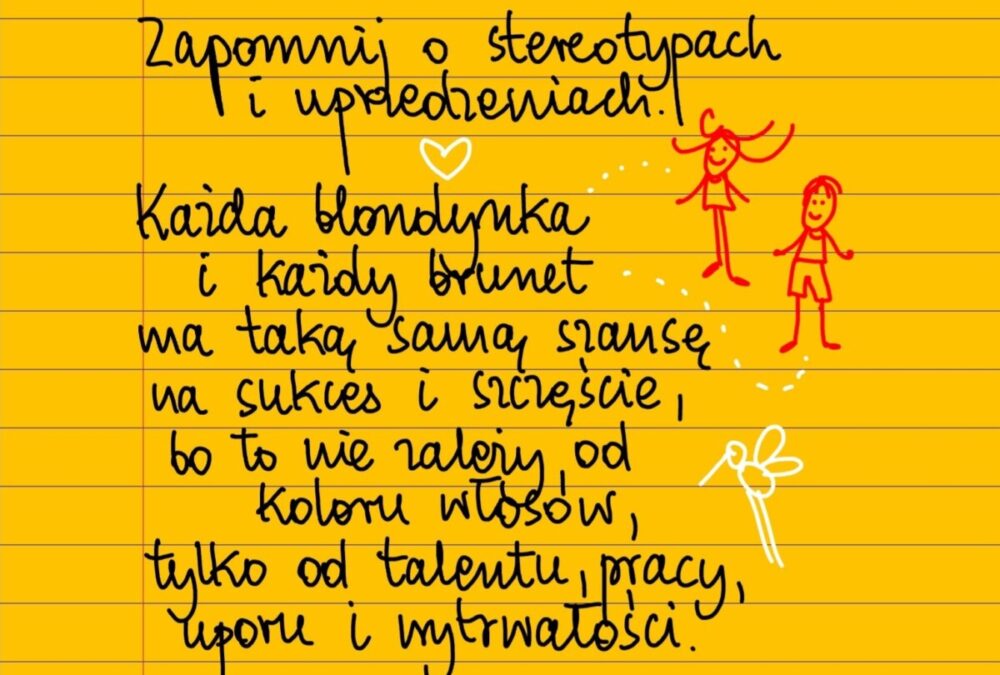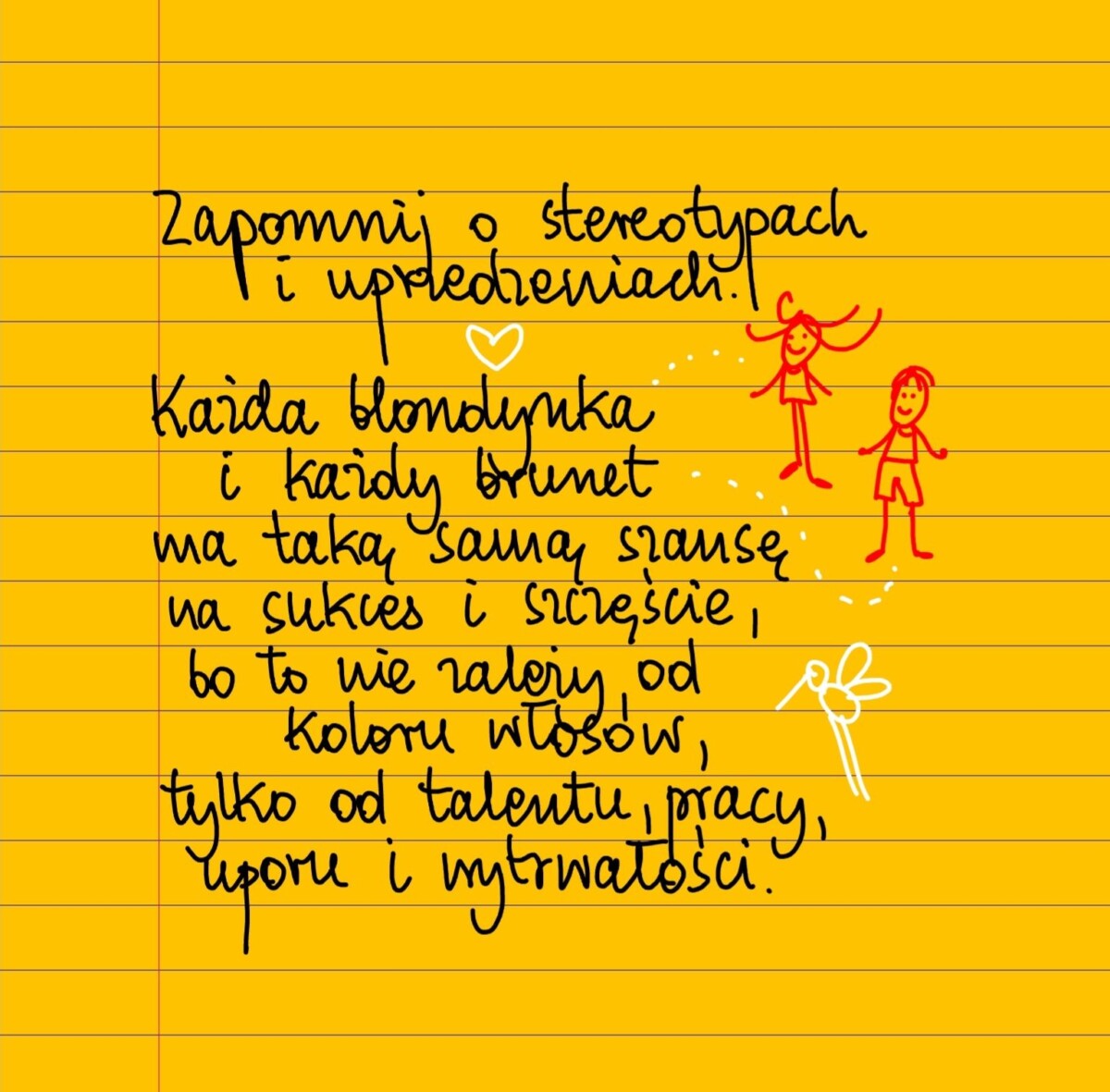 Zapomnij o stereotypach, przesądach i uprzedzeniach. Każda blondynka i każdy brunet ma taką samą szansę na sukces i szczęście, bo to nie zależy od koloru włosów, tylko talentu, uporu i wytrwałości. #żółtakartka