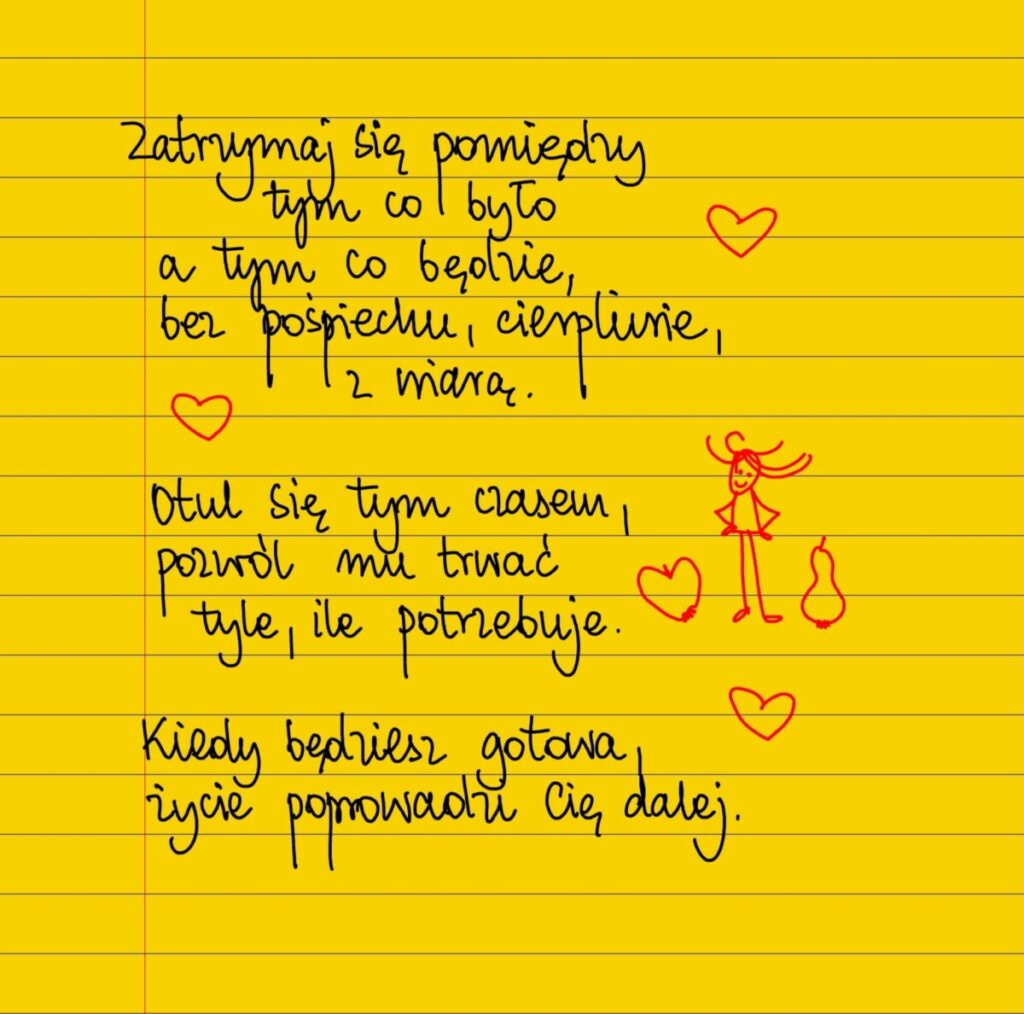 Zatrzymaj się pomiędzy tym co było a tym co będzie, bez pośpiechu, cierpliwie, z wiarą. Otul się tym czasem, pozwól mu trwać tyle, ile potrzebuje. Kiedy będziesz gotowa, życie poprowadzi cię dalej. #żółtakartka