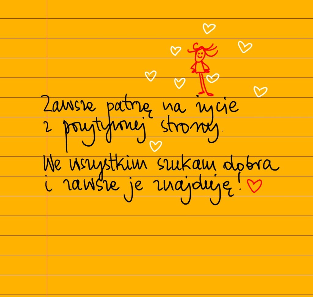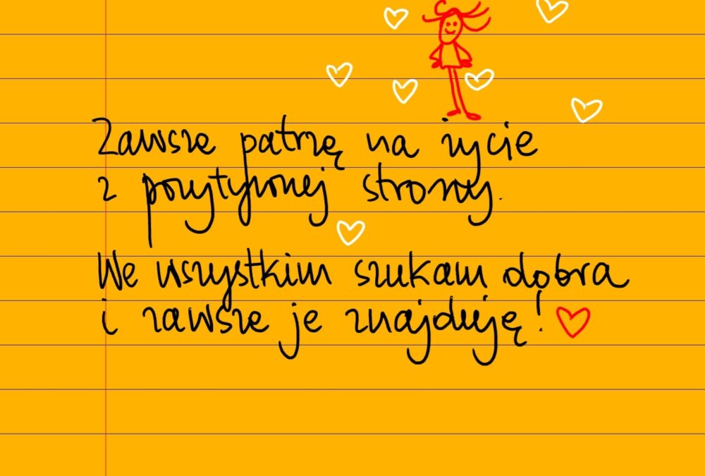 Żółte kartki Zawsze patrzę na życie z pozytywnej strony piątek, 02.08.2024 Zawsze patrzę na życie z pozytywnej strony. Wiem, że wszystko ma sens. We wszystkim szukam dobra i zawsze je znajduję ❤ Udostępnij na Facebooku