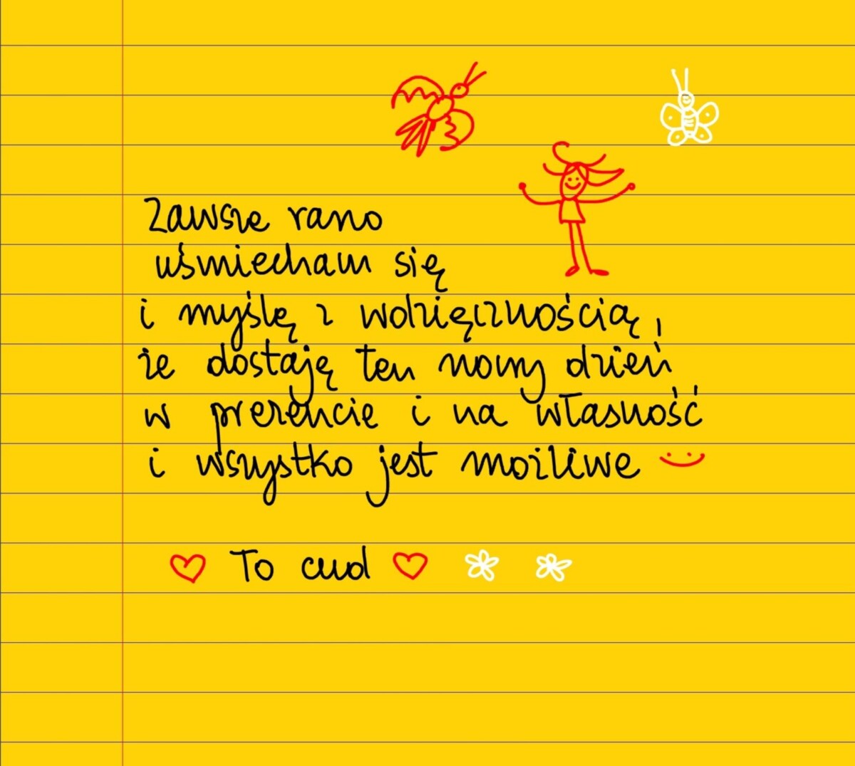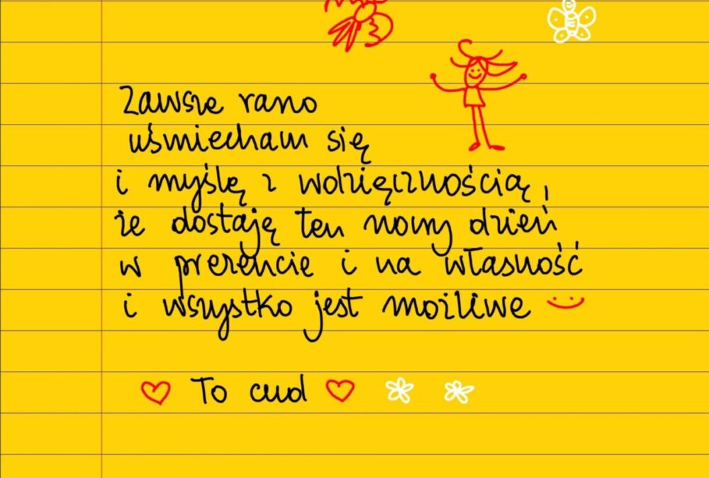 Żółte kartki Zawsze rano uśmiecham się środa, 18.08.2021 Zawsze rano uśmiecham się i myślę z wdzięcznością, że dostaję ten nowy dzień w prezencie i na własność i wszystko jest możliwe. To cud 😊❤ #żółtakartka Udostępnij na Facebooku