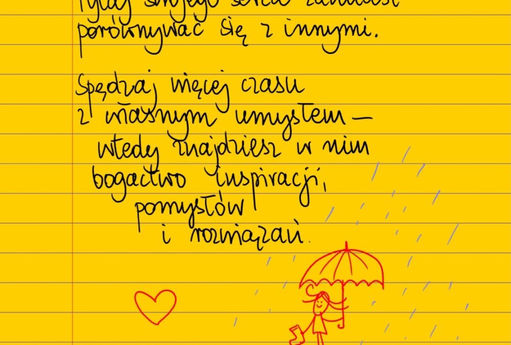 Znajdź własną ścieżkę. Pytaj swojego serca zamiast porównywać się z innymi. Spędzaj więcej czasu z własnym umysłem – wtedy znajdziesz w nim bogactwo inspiracji, ponysłów i rozwiązań. #żółtakartka