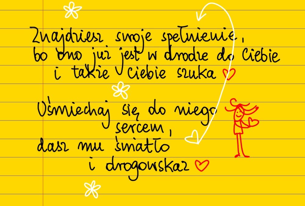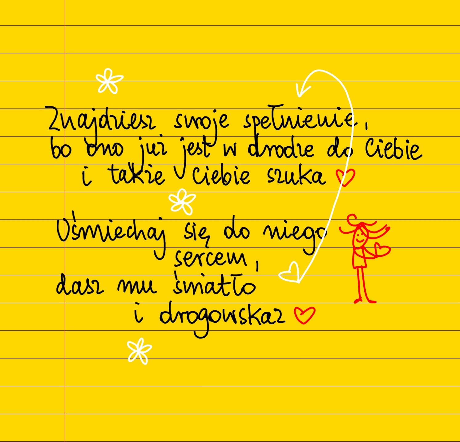 Żółte kartki Znajdziesz swoje spełnienie czwartek, 04.04.2024 Znajdziesz swoje spełnienie, bo ono już jest w drodze do Ciebie i także Ciebie szuka. Uśmiechaj się do niego sercem, dasz mu światło i drogowskaz ❤ #żółtakartka #beatapawlikowska Udostępnij na Facebooku