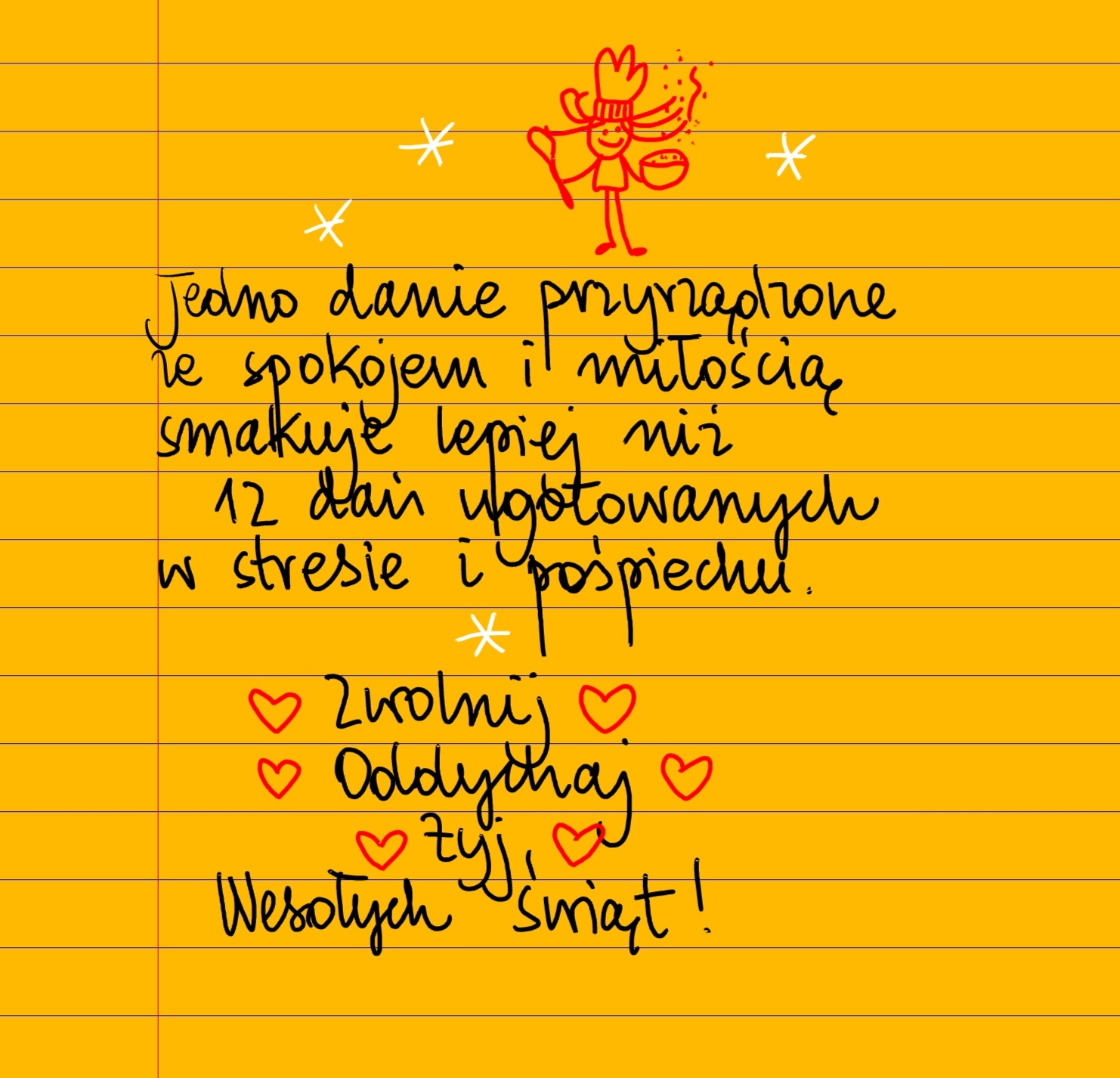 Żółte kartki Zwolnij piątek, 20.12.2024 Jedno danie przyrządzone ze spokojem i miłością smakuje lepiej niż 12 dań ugotowanych w stresie i pośpiechu. Zwolnij ❤ Oddychaj ❤Żyj ❤Wesołych Świąt! Udostępnij na Facebooku