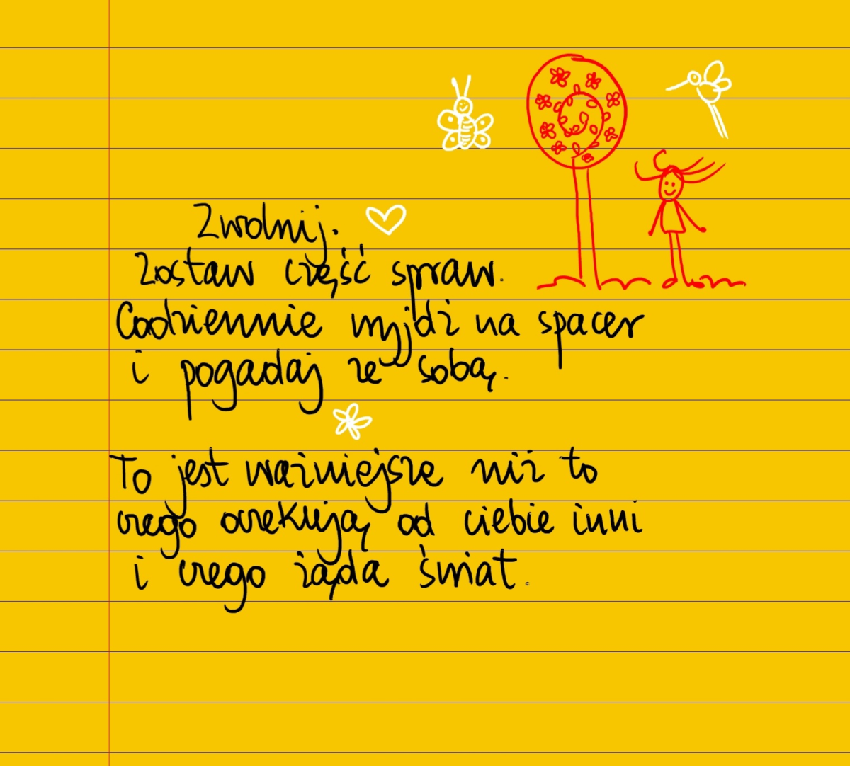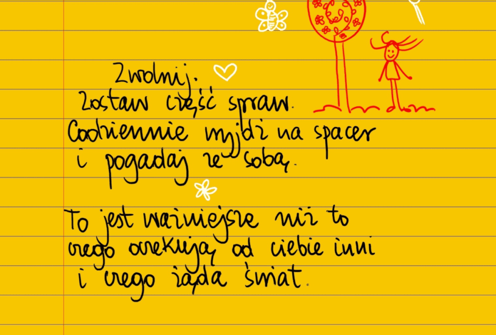 Żółte kartki Zwolnij czwartek, 12.09.2024 Zwolnij. Zostaw część spraw. Codziennie wyjdź na spacer i pogadaj ze sobą. To jest ważniejsze niż to czego oczekują od ciebie inni i czego żąda świat. #żółtakartka Udostępnij na Facebooku