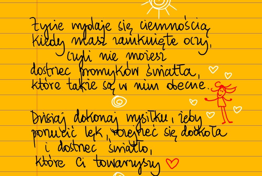 Życie wydaje się ciemnością kiedy masz zamknięte oczy, czyli mówiąc inaczej, kiedy nie jesteś w stanie dostrzec promyków światła, które także są w nim obecne. Kiedy całym sobą koncentrujesz się na ciemności, która ci przeszkadza, odbierasz sobie nadzieję i wewnętrzną moc. Dokonaj dzisiaj wysiłku, żeby porzucić na chwilę lęk, rozejrzeć się dookoła i dostrzec światło, które ci towarzyszy ❤ #żółtakartka #beatapawlikowska